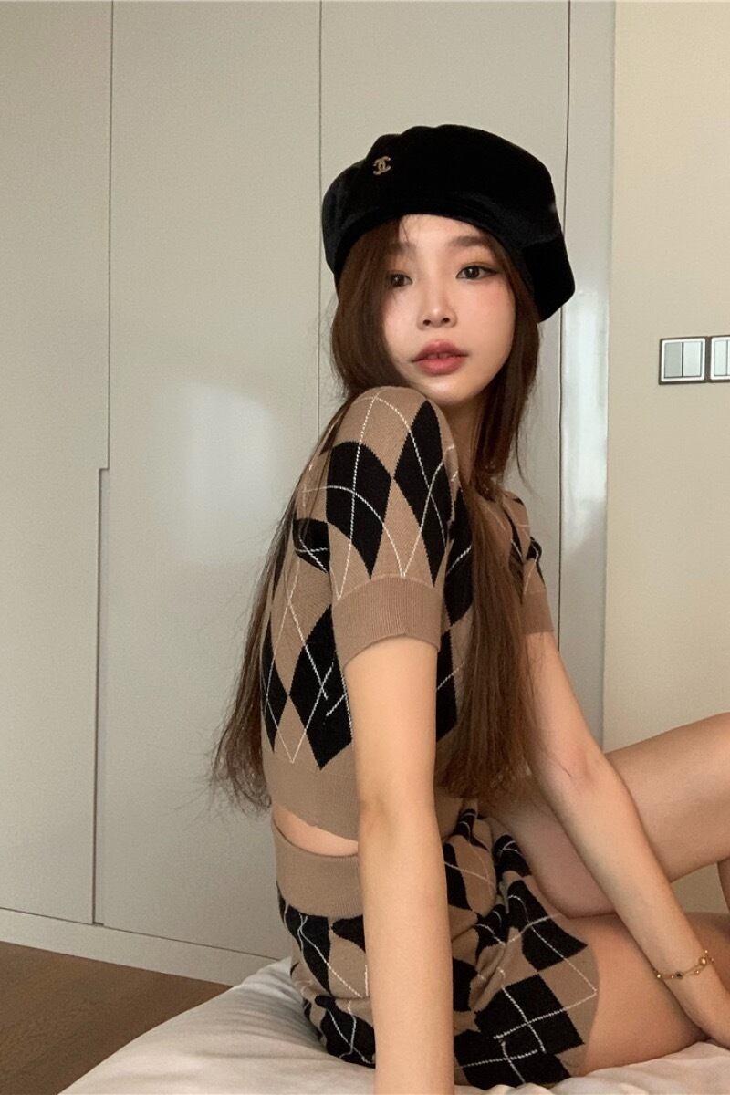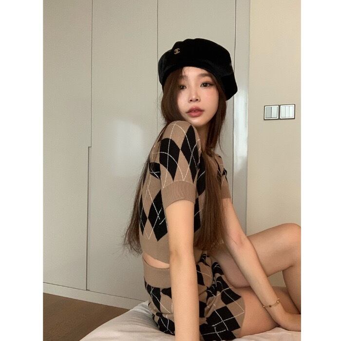 アメリカン ホット ガール スーツ レトロ菱形 V ネック スリム ニット トップ ボタン弾性ウエスト ヒップ ラップ スカート服 エラスティック 伸縮 Vネック got62058272387