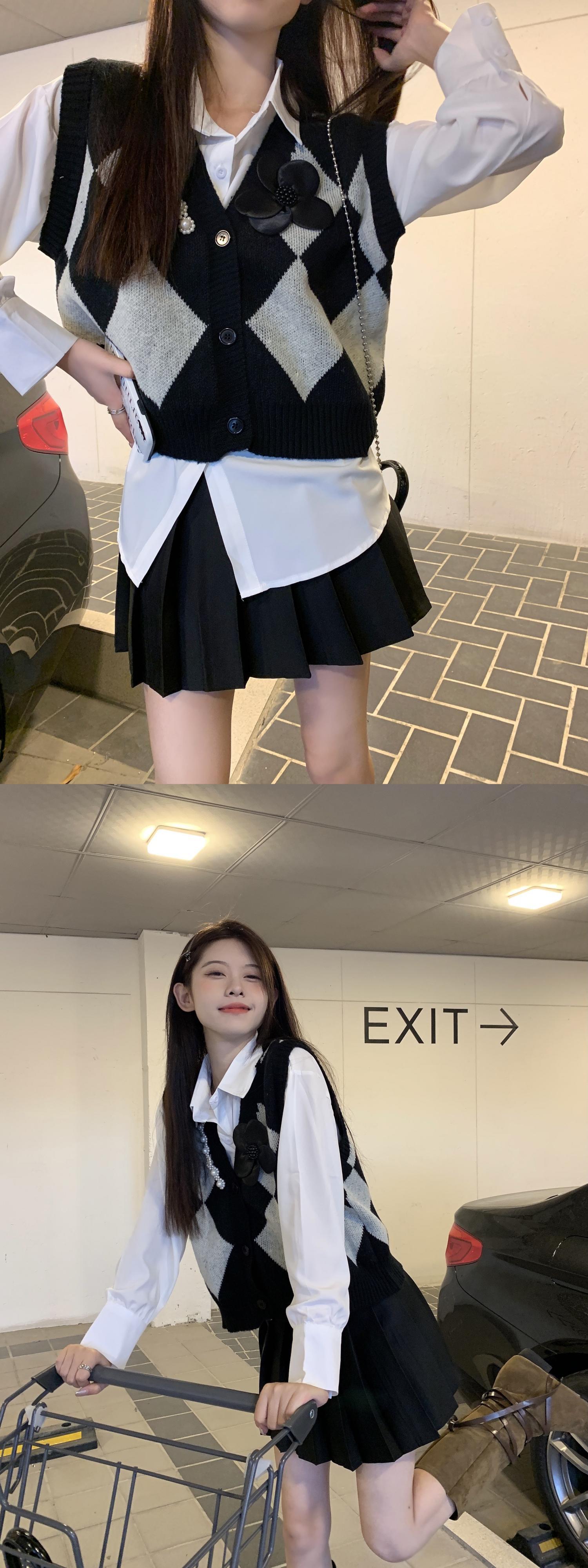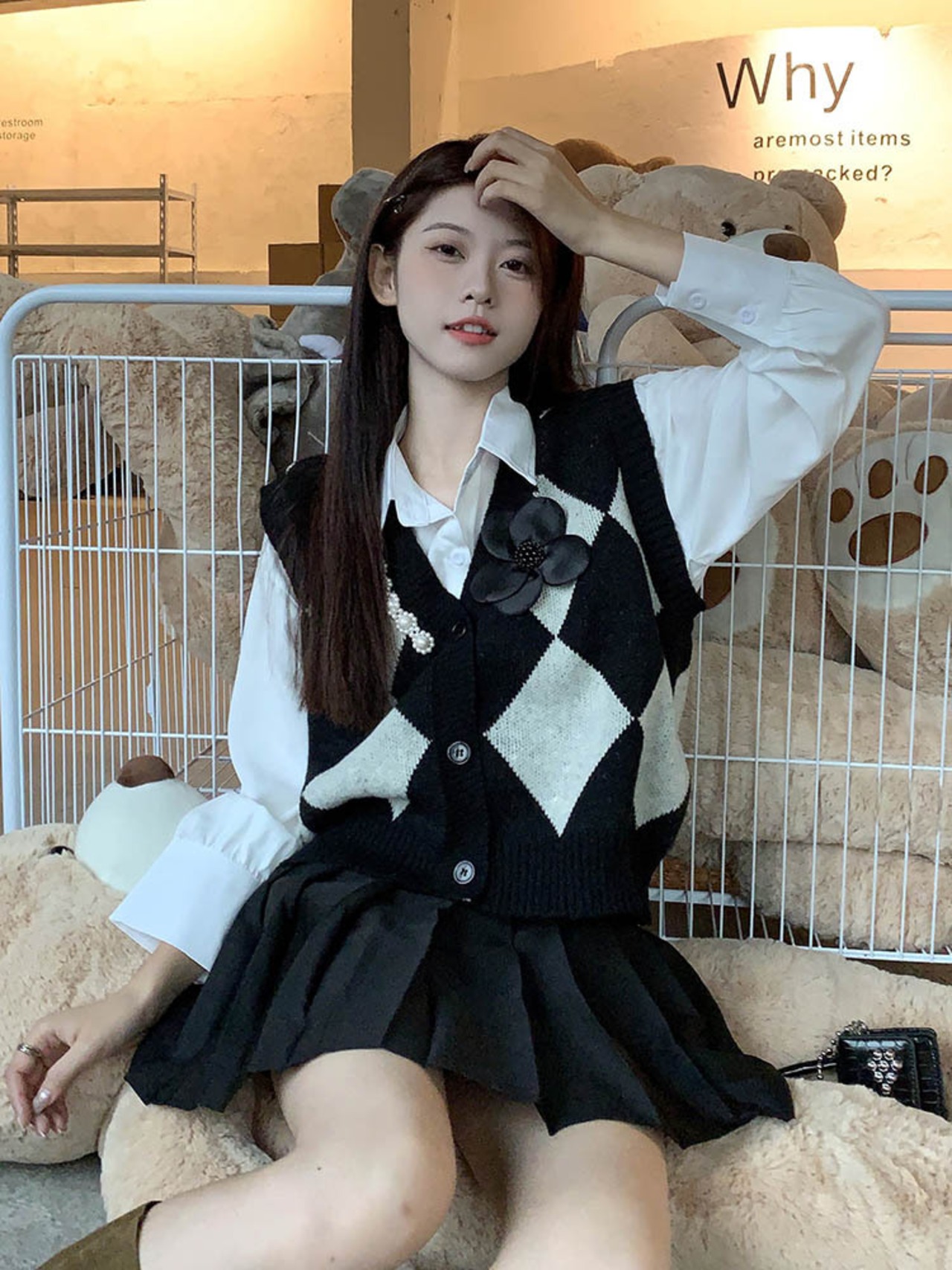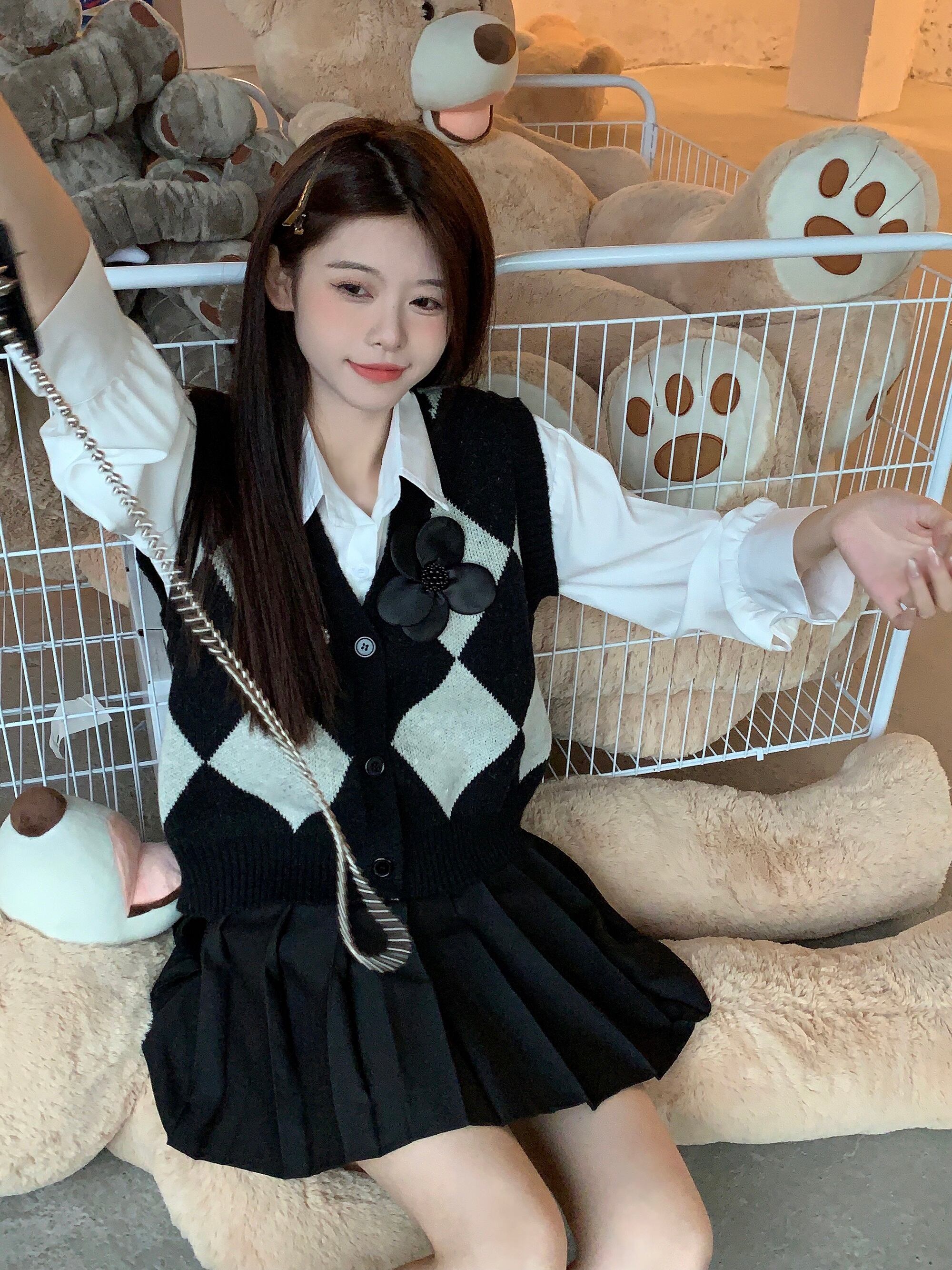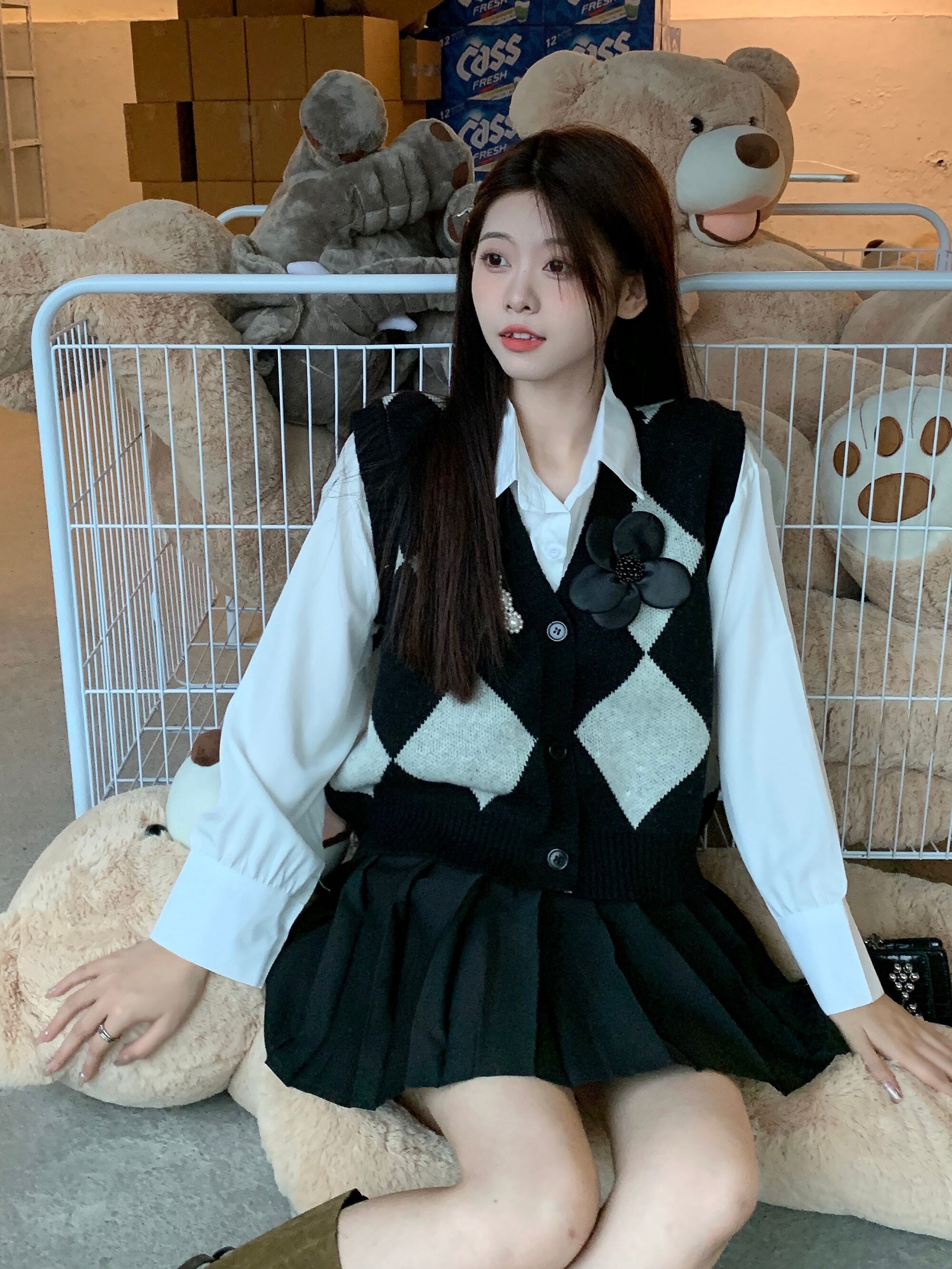 3 ピースセットレディース衣装リンジベストコート白シャツプリーツスカート無地梨花服秋スカートセット ホワイト オータム 秋物 ソリッドカラー got26461870613