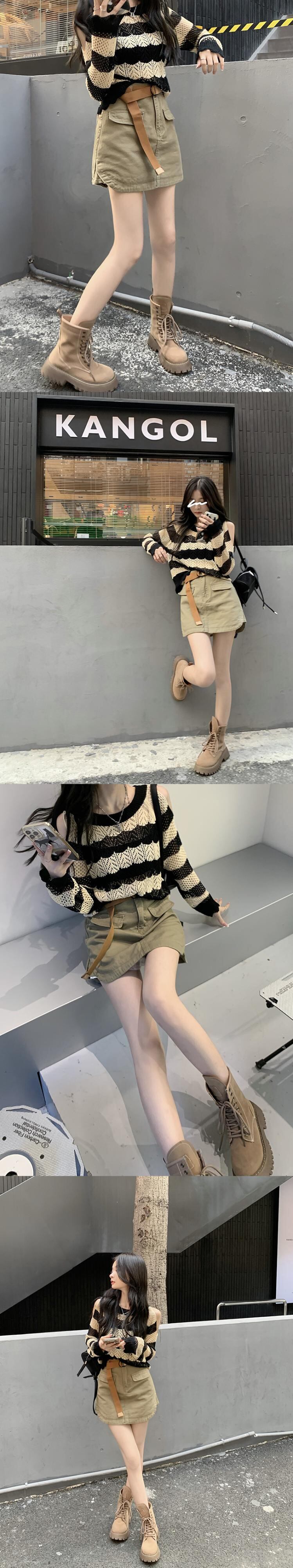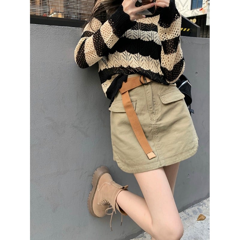 スカートセット ゆったり オフショルダー ストライプ 中空 長袖 ニットセーター+ウエストAラインスカート 秋 ツーピース ロング オータム 秋物 got23042808836