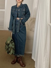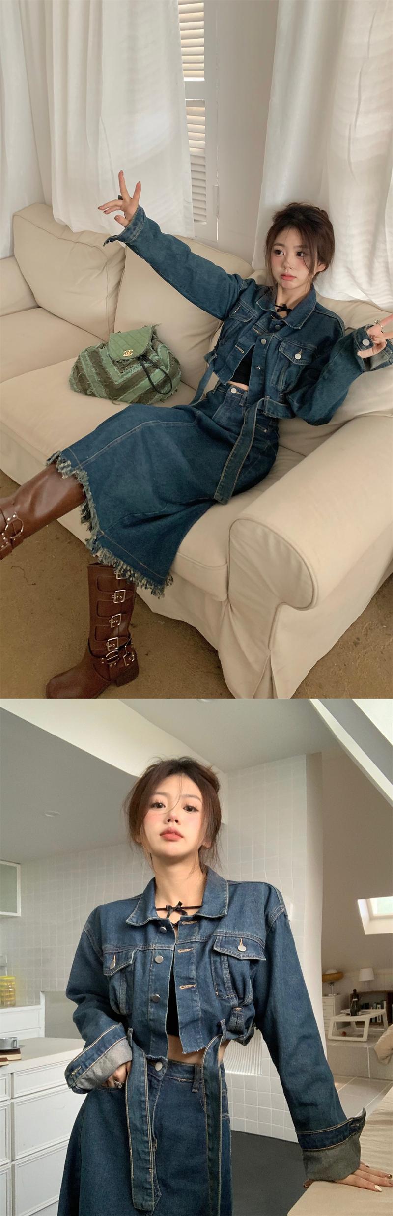 万能スーツ長袖ショートデニムコートウエストテルスカートツーピースセット服 ロング got84608207535