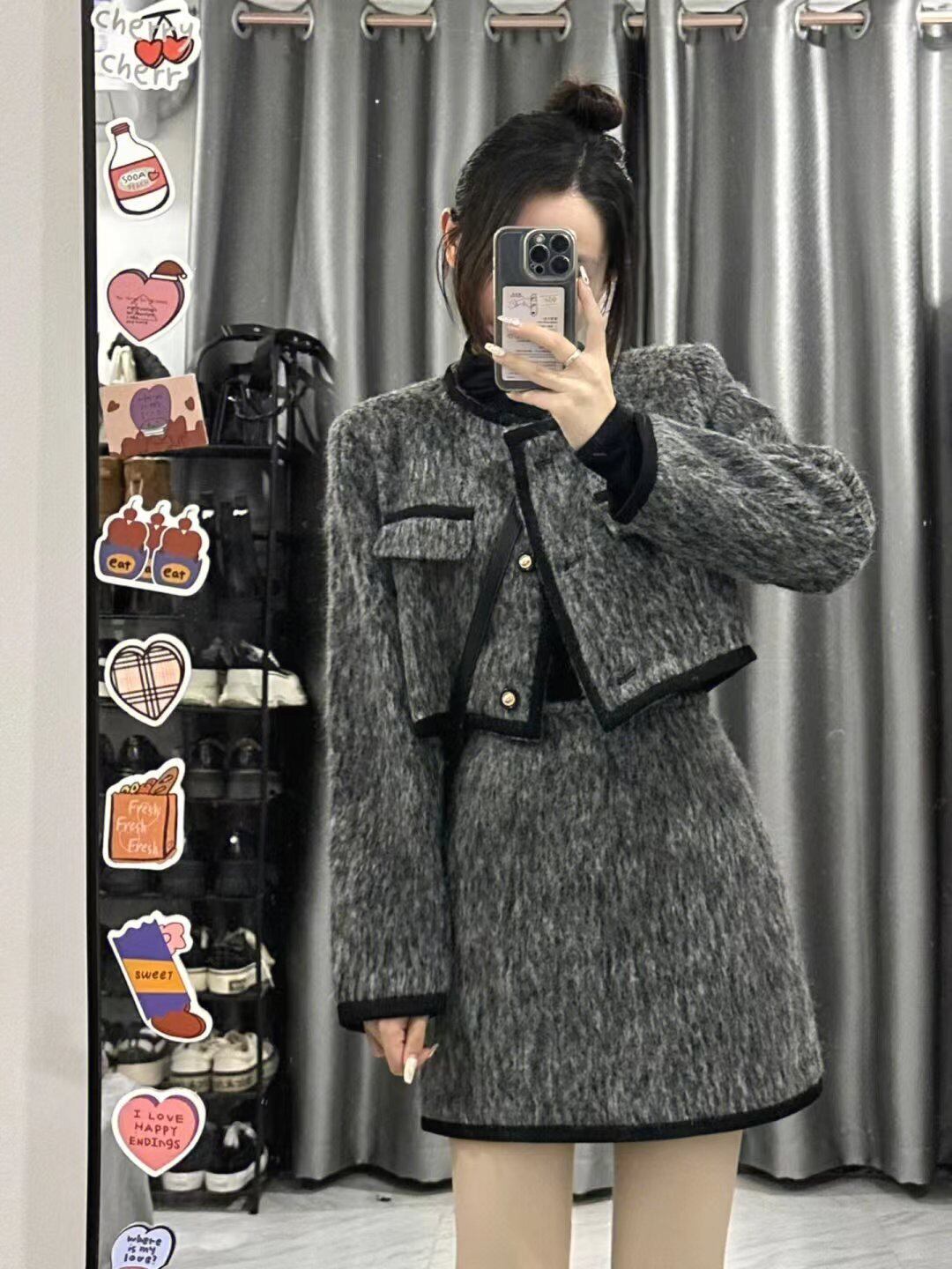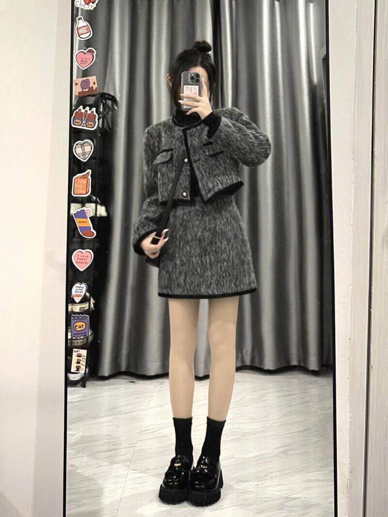 通勤 スーツ レディース 秋冬 プレミアム ウール 長袖 Oネック コート ウエスト ショート スカート 2点セット ロング オータム 秋物 ウィンター 冬物 got87973461511