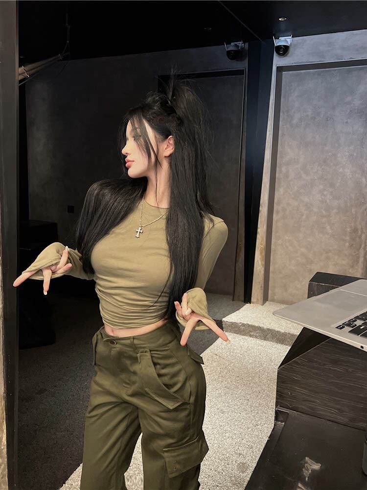 レディース ツーピース セット ソリッド スリム フィット Tシャツ ウエスト ポケット パンツ プレッピー スタイル 秋 ホット ガールズ セット オータム 秋物 ソリッドカラー got68710144450