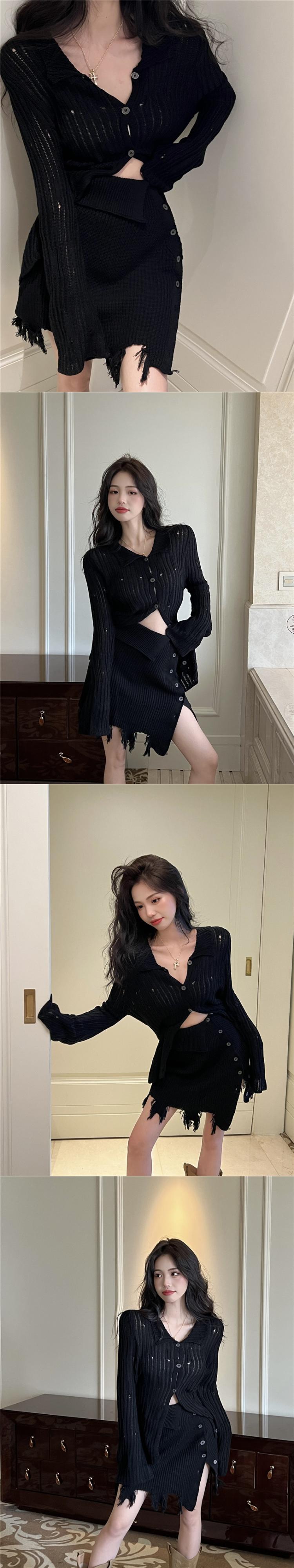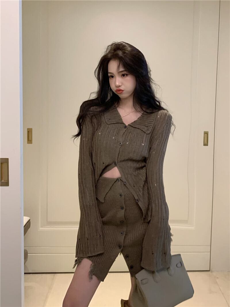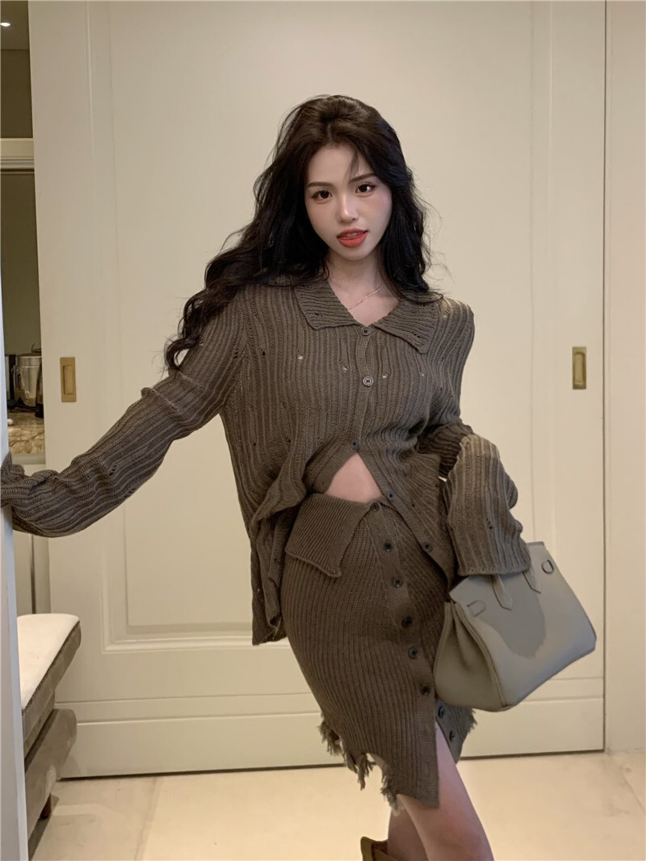 くり抜きニットセーター感覚万能レディース秋冬スリムスカートツーピースセット服 オータム 秋物 ウィンター 冬物 got35241895573