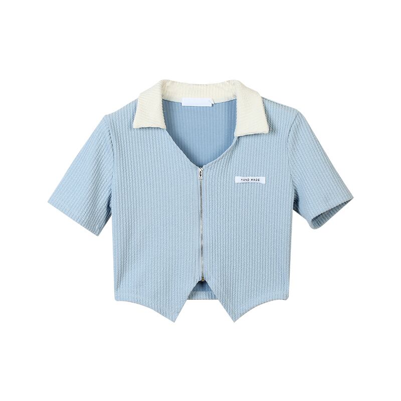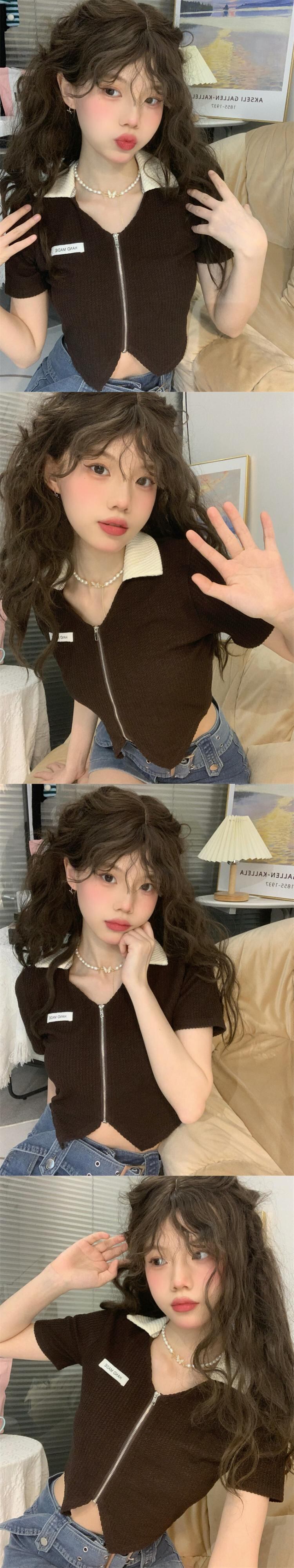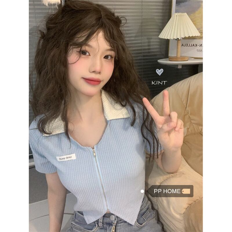 ショート Tシャツ女性ホットガール半袖ニットセーター夏レトロスモール V ネックジッパーショートトップ女性原宿 Y2k ハーフスリーブ かわいい サマー 夏物 Vネック got30303636728