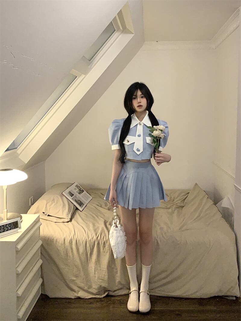 ツーピースセットレディース衣装甘いスーツバブルスリーブトッププリーツスカートソリッド梨花服夏スカートセット 大人ガーリー スウィート キュート カジュアル サマー 夏物 ソリッドカラー got32273781475