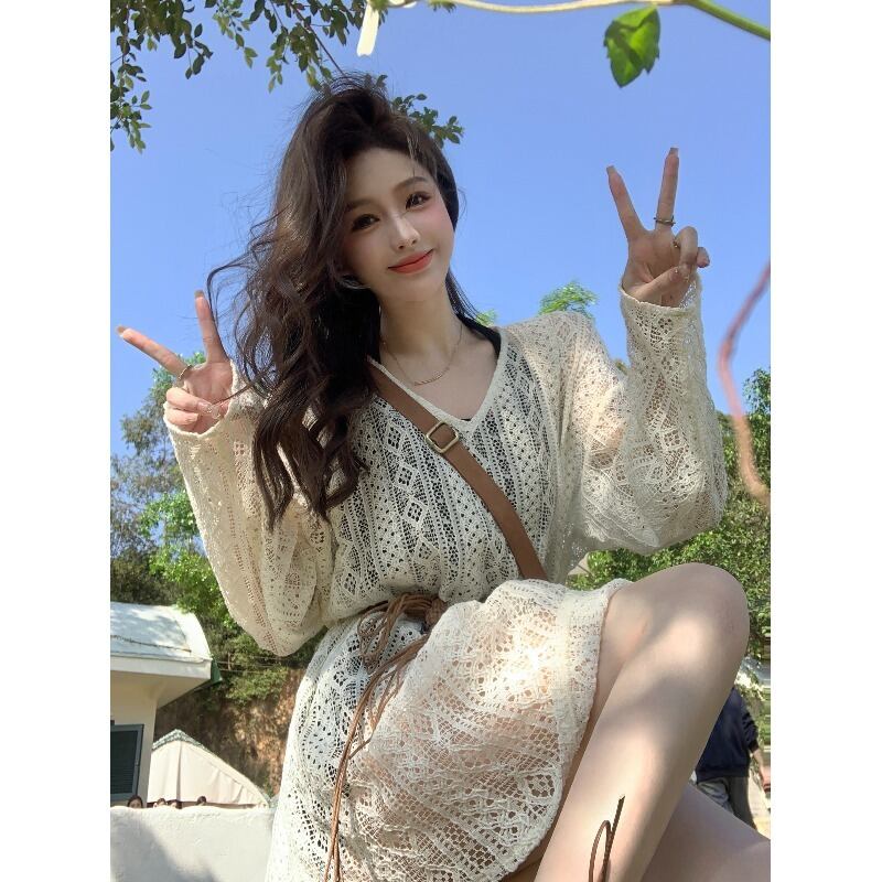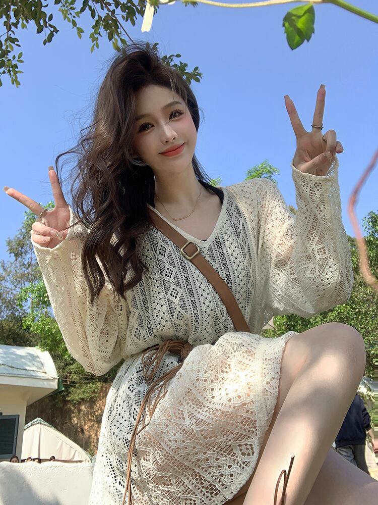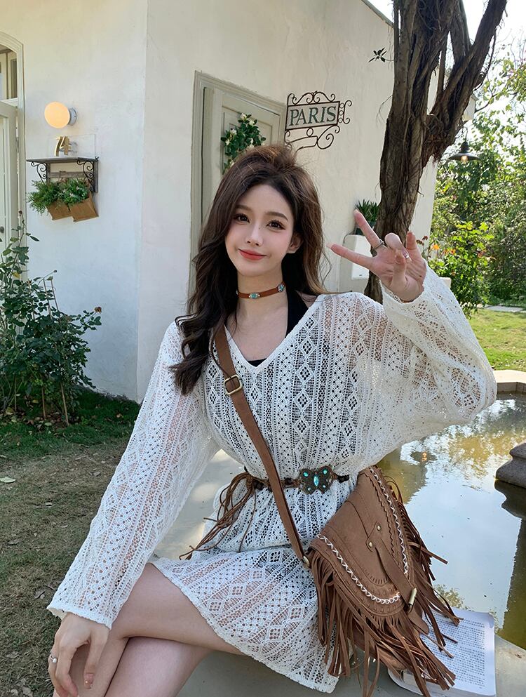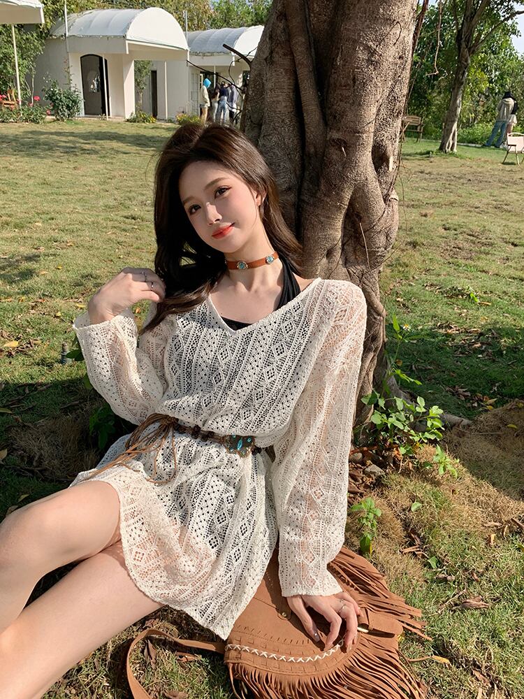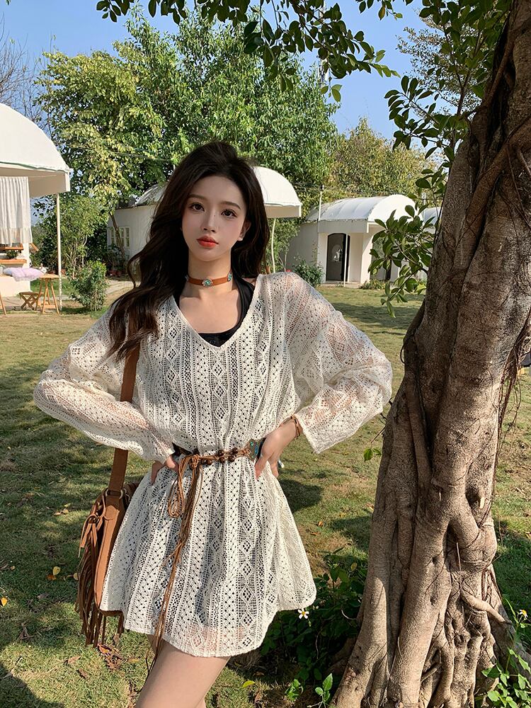 スウィート ガール スーツ レディース 中空アウト 漁網 ロング Tシャツ 春 Vネック ホルター スリム ドレス 2点セット 大人ガーリー キュート カジュアル スプリング 春物 got93146515267