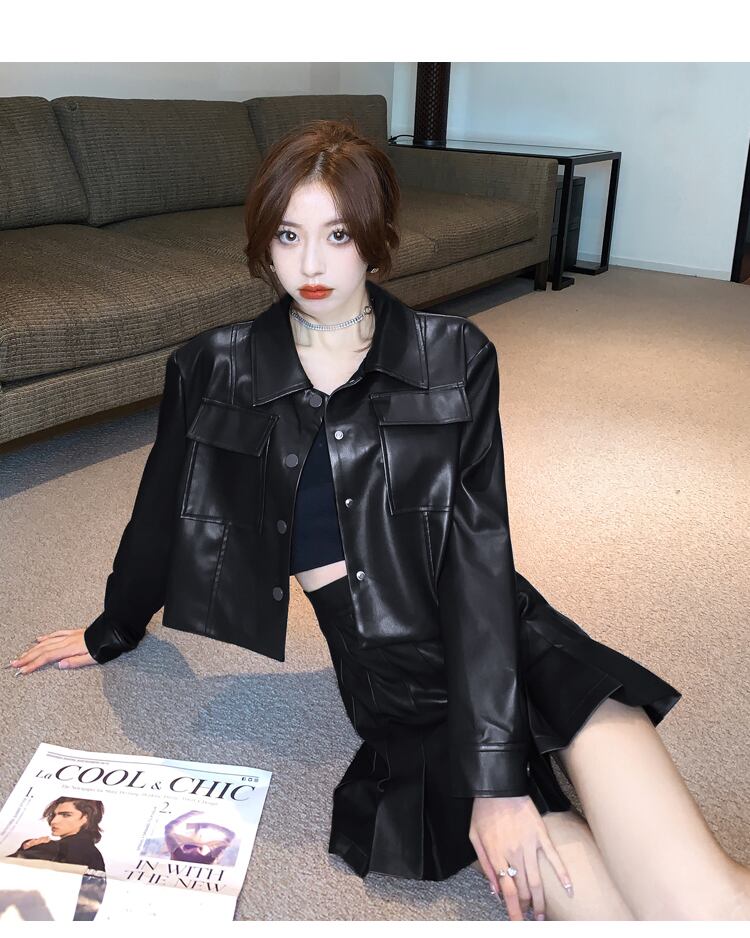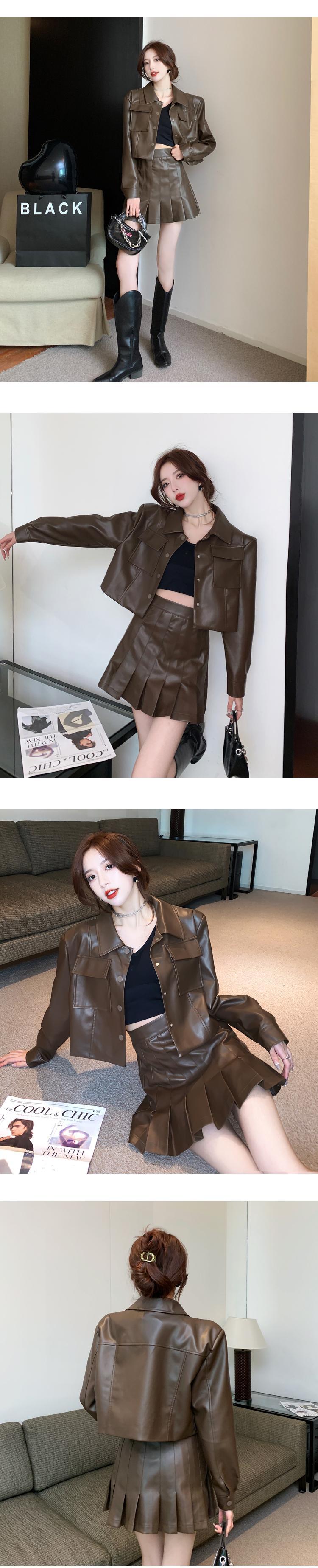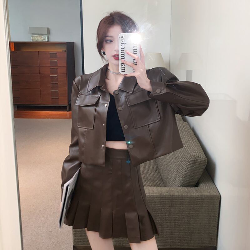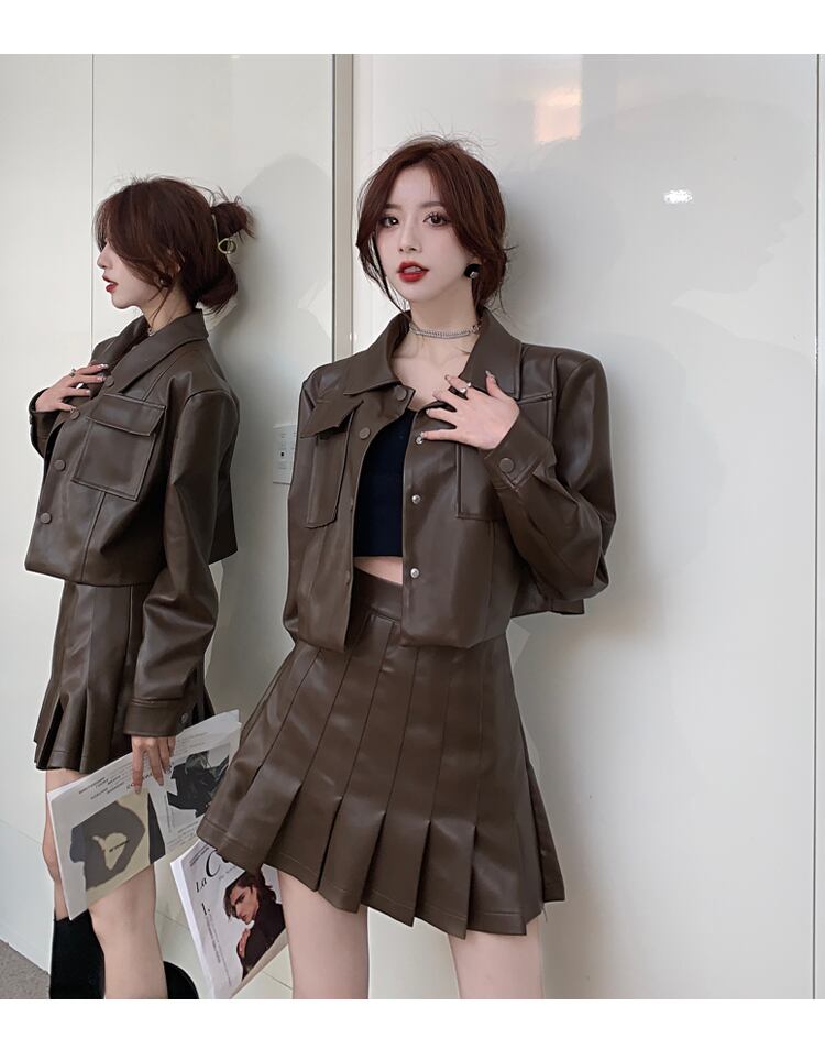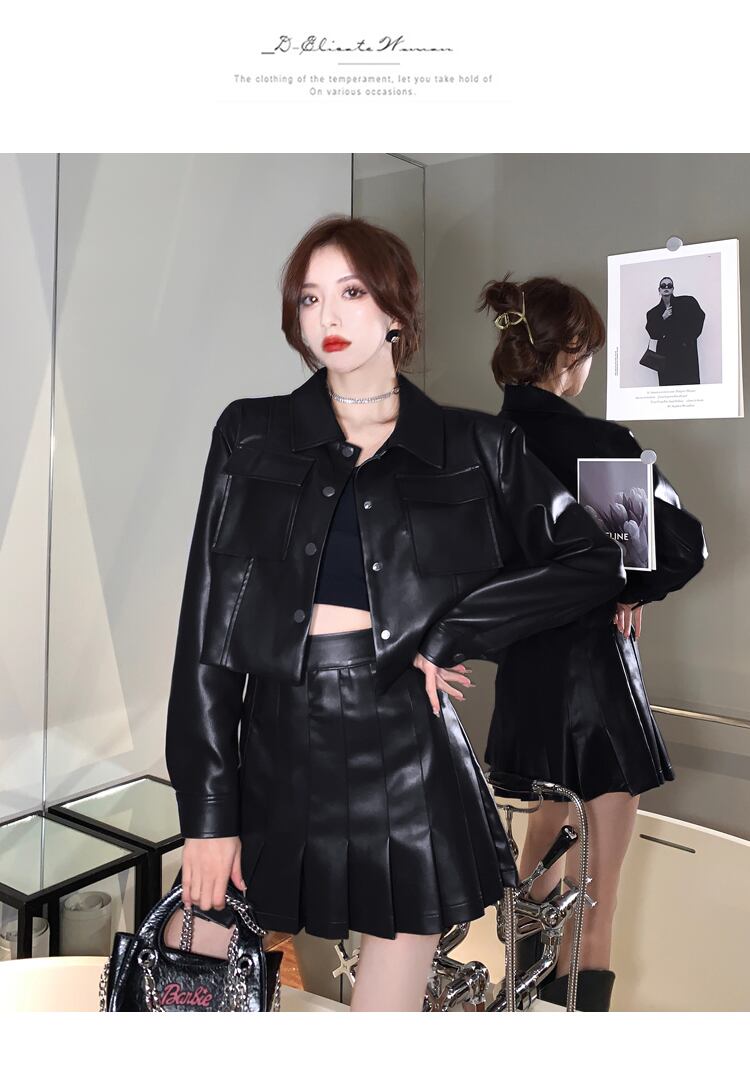 Gothiscyn ツーピースセットレディース衣装 PU レザーショートコートプリーツスカート無地梨花服秋/冬スカートセット オータム 秋物 ウィンター 冬物 ソリッドカラー got79879226270