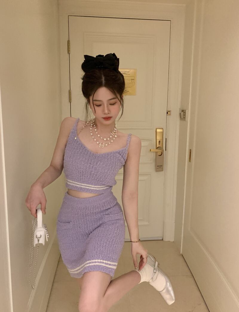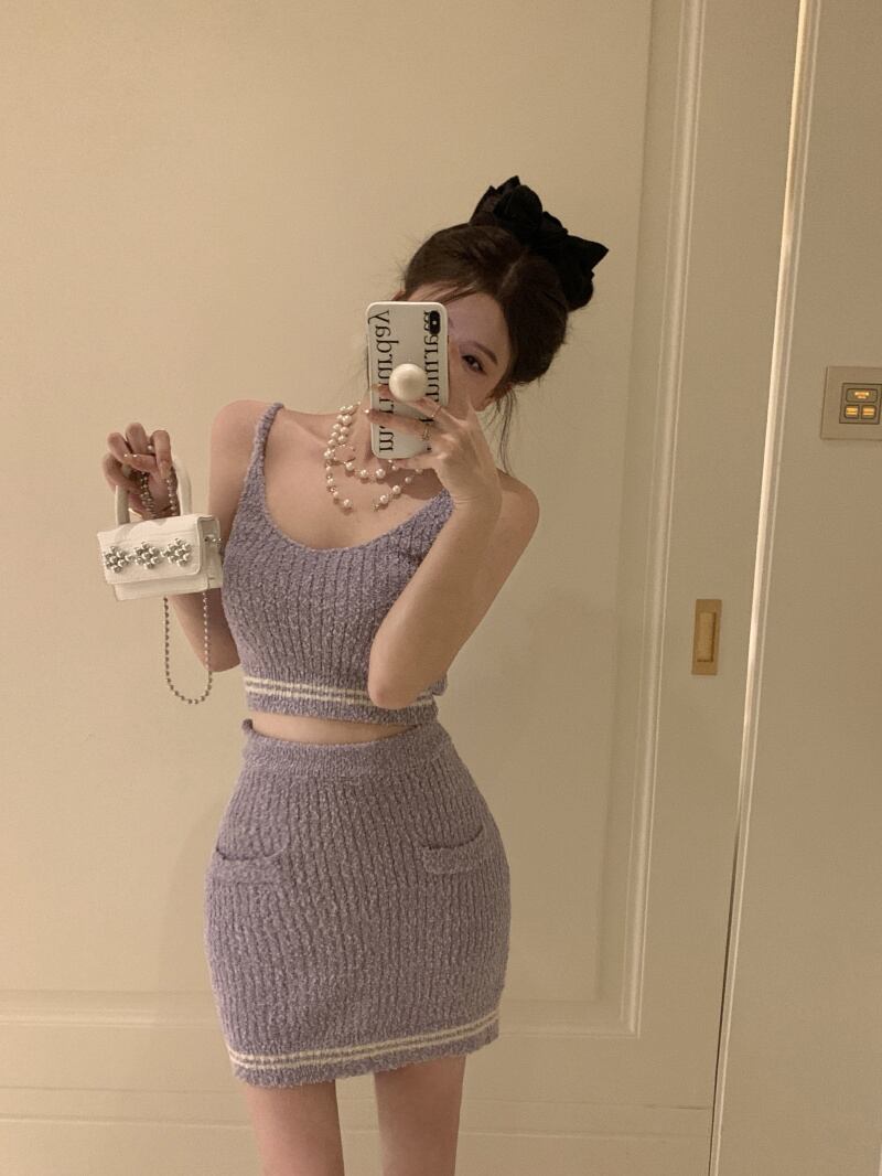 パープル ホット ガール スーツ女性の春ニット サスペンダー ベスト ウエスト ヒップ スカート 2 点セット服 スプリング 春物 got43175938274