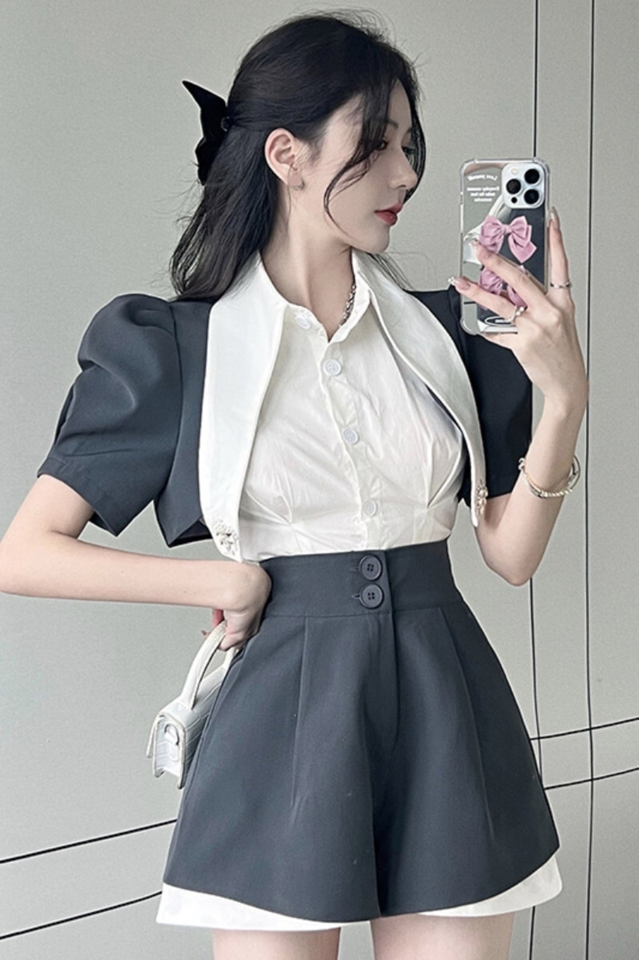 OL通勤スーツ レディース コントラスト バブルスリーブ ターンダウンカラー シャツ ウエスト ショーツ 2点セット 洋服 ブルマー 会社 学校 通勤や通学にも got69788755126