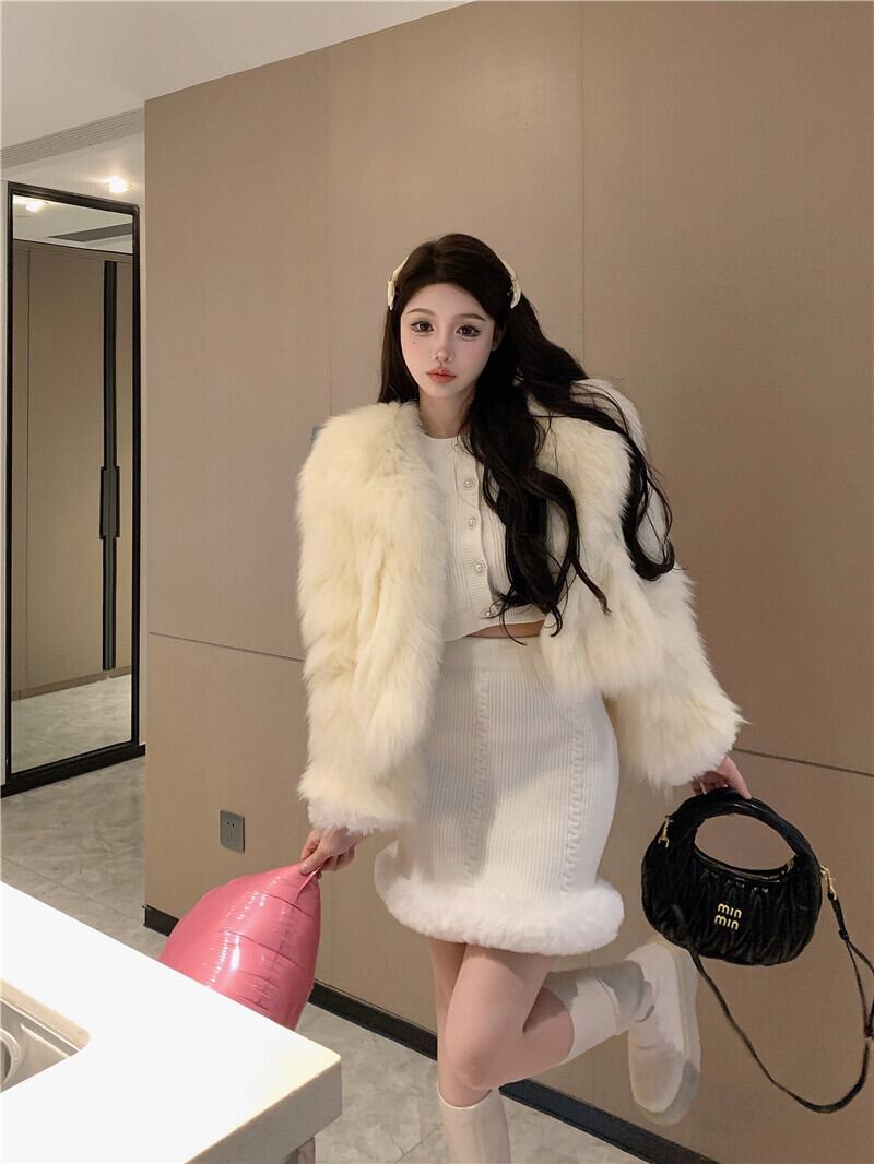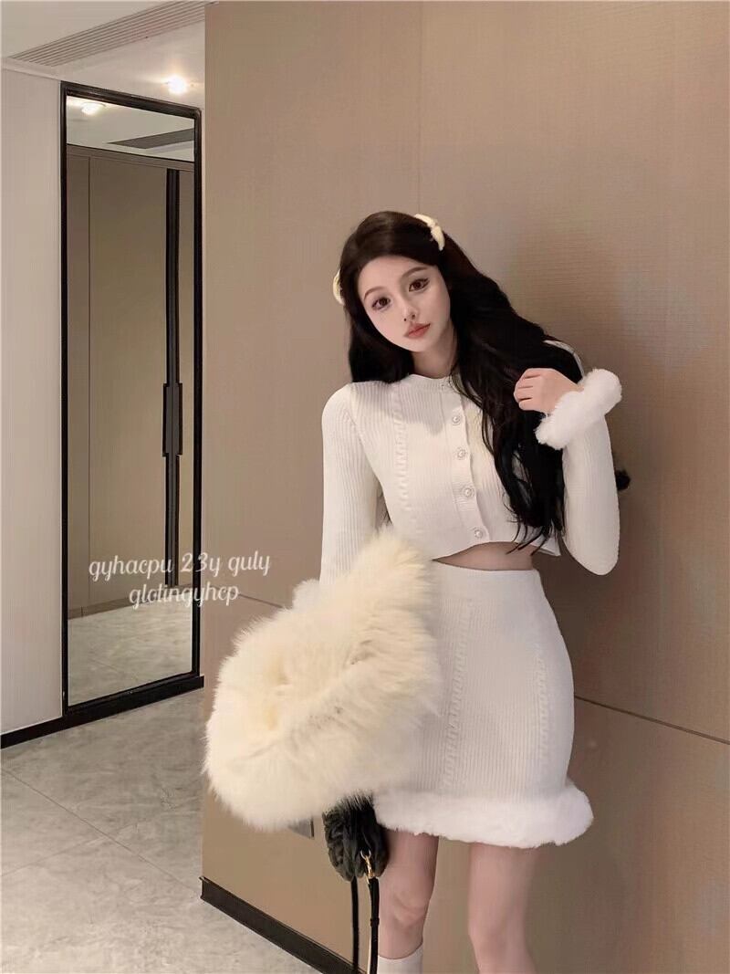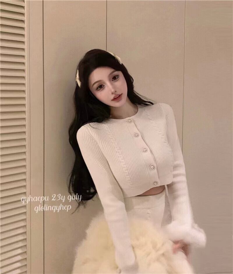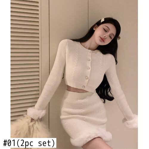 ニットスーツ レディース プラッシュスリーブスプライシング ショートカーディガン トップス ウエストヒップラップ スカート 2点セット 洋服 got7000663162