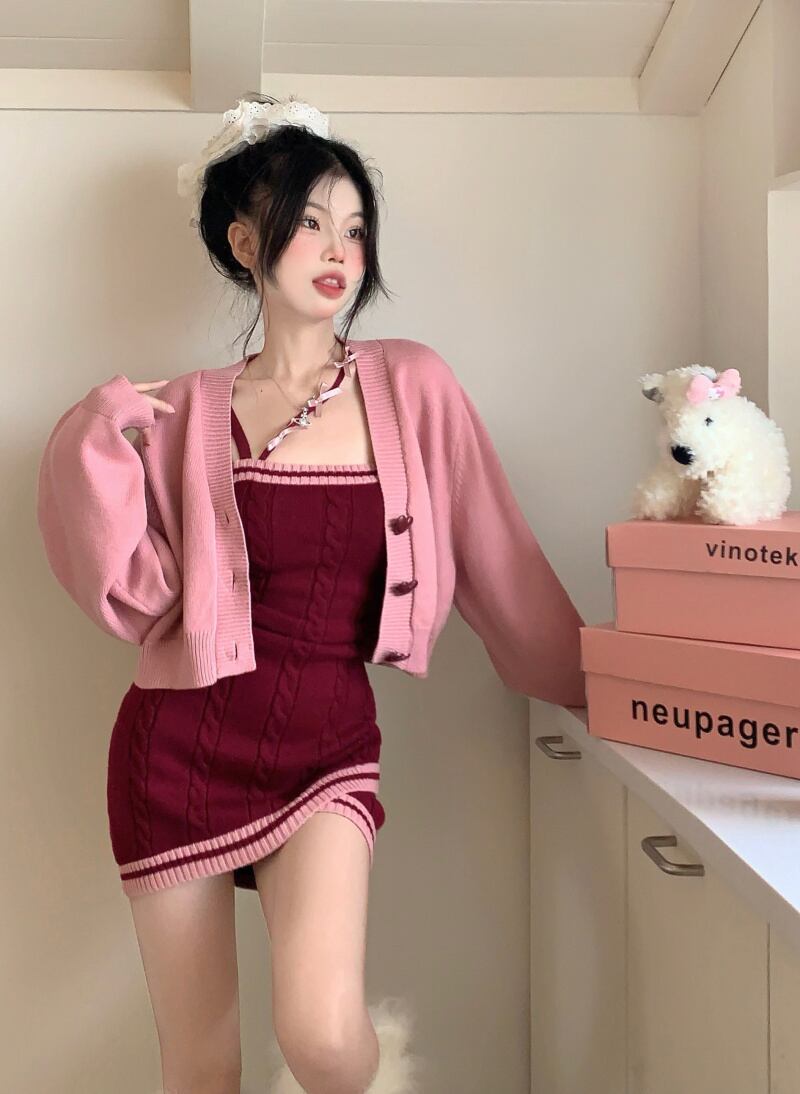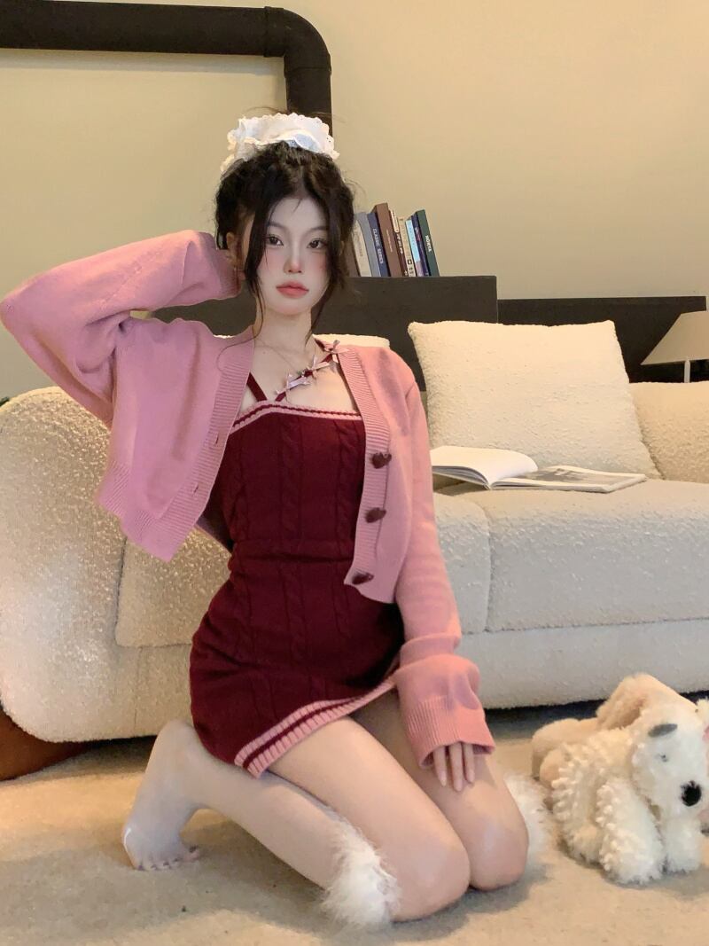 ホットガールスーツ女性のニットスパゲッティストラップドレス冬のピンクのセーターカーディガン 2 点セット甘い服 大人ガーリー スウィート キュート カジュアル ウィンター 冬物 got43019028426