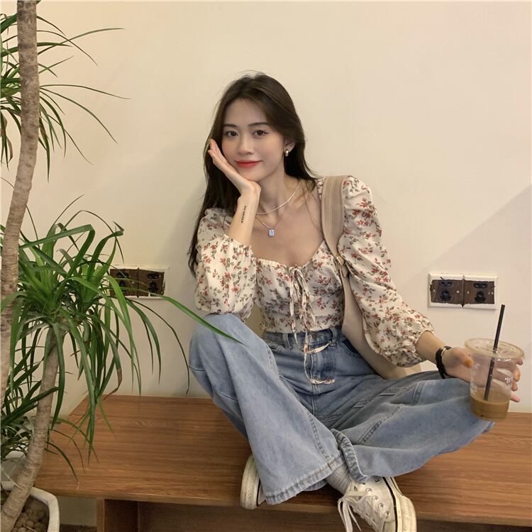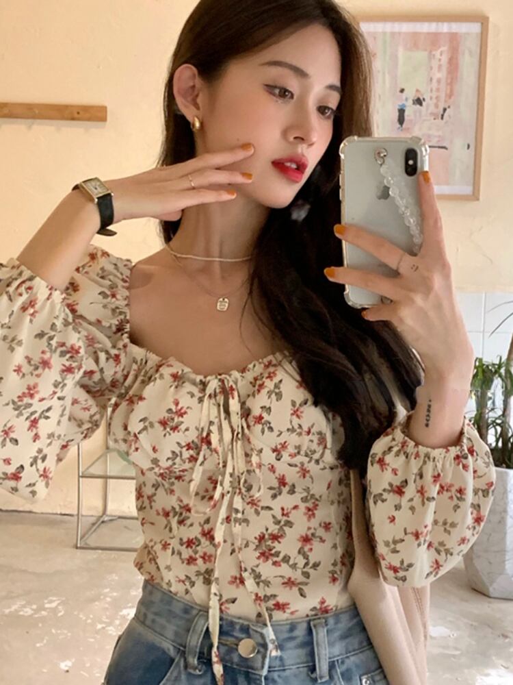 Gothiscyn レディース 花柄ブラウス シャツ 長袖 ローカット スクエアカラー サマートップ サマーストリート ロング 夏物 スクウェア got47881527710