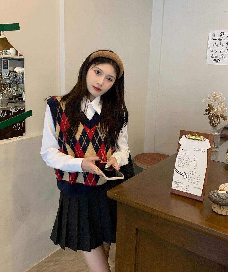 ガールスーツ レディース チェック柄 ニットベスト ショート 長袖 ダブルポケット 白シャツ プリーツスカート 3点セット ロング ホワイト got39994573919