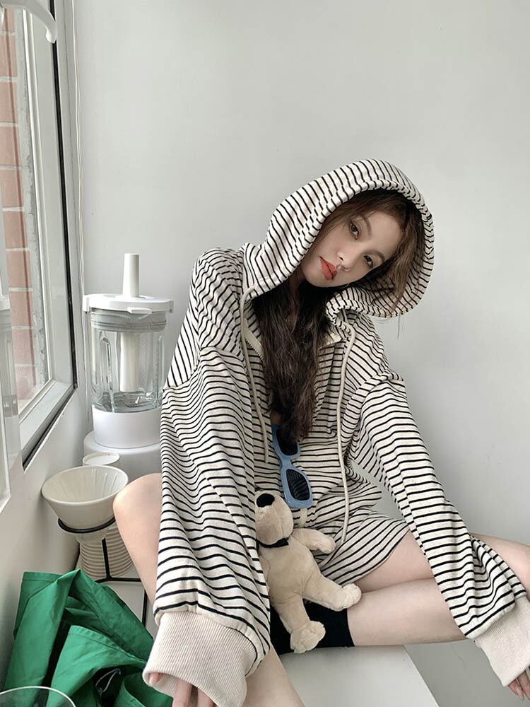 ツーピースセットレディース衣装スーツフード付き長袖ストライプセータージャケットワイドレッグショート梨花服秋セット ロング オータム 秋物 ワイドパンツ got332743607