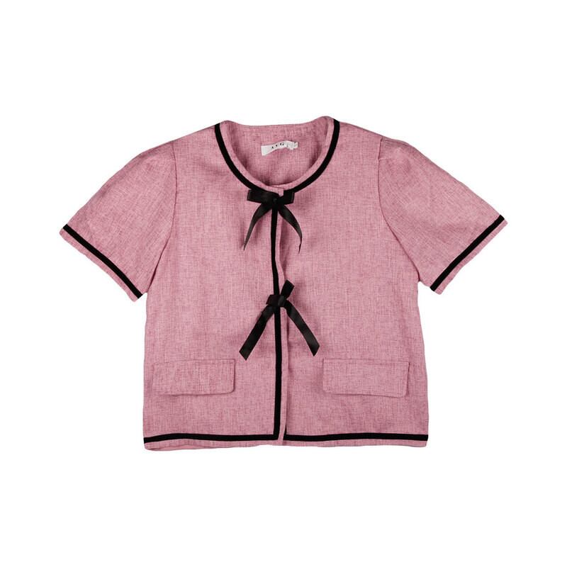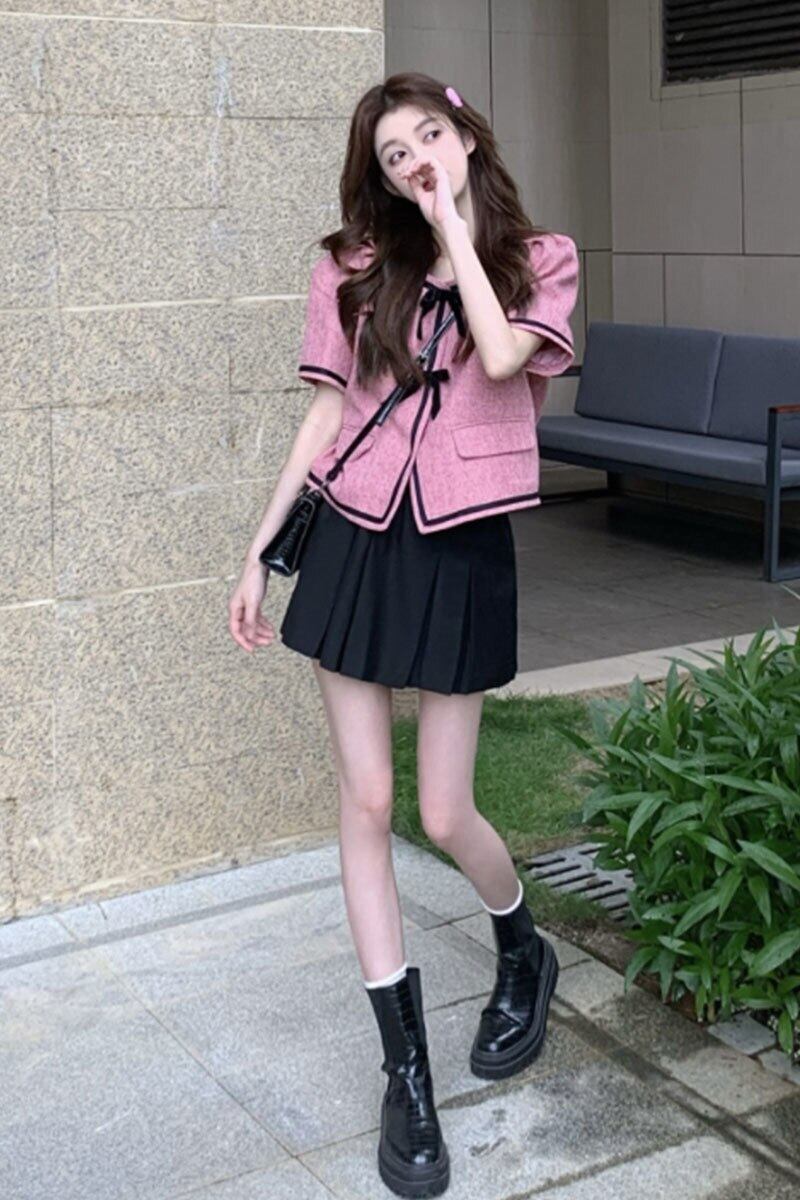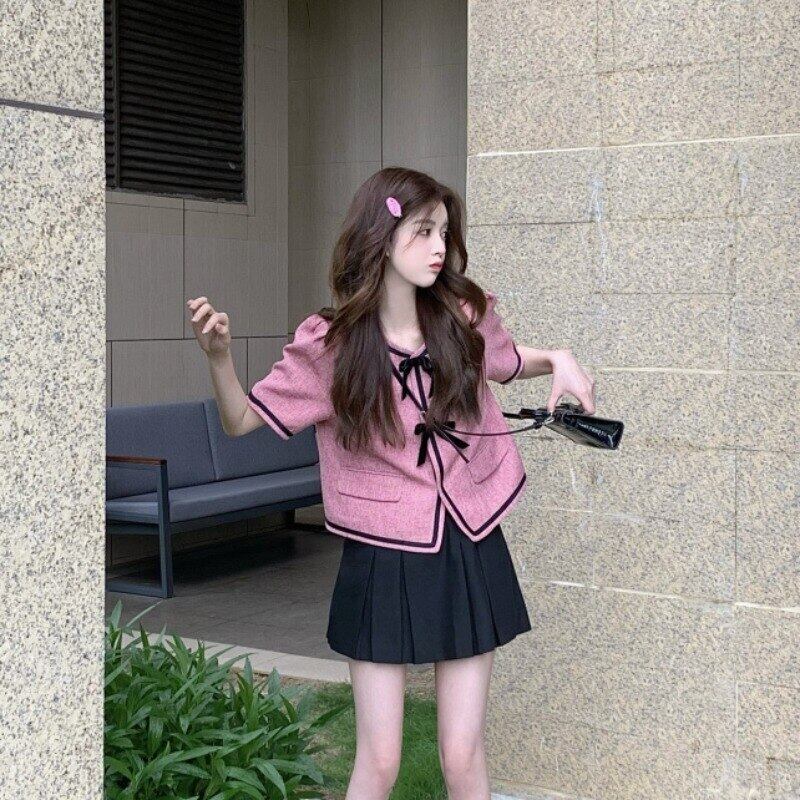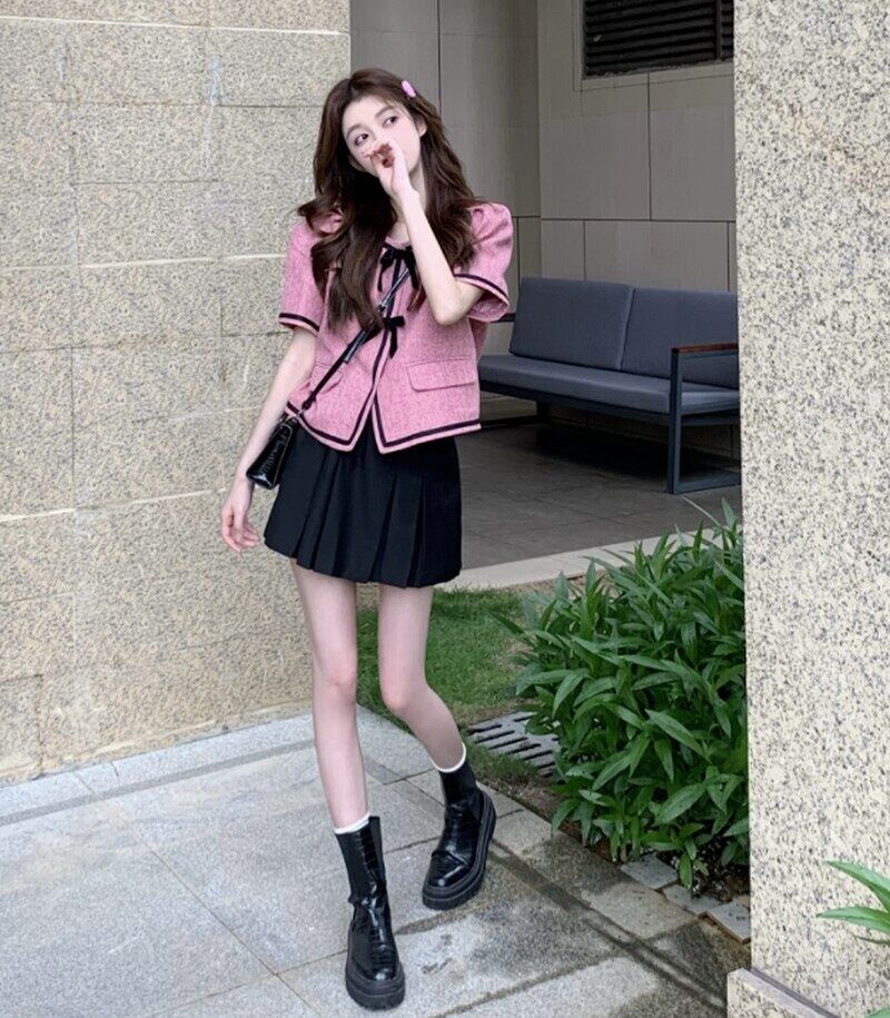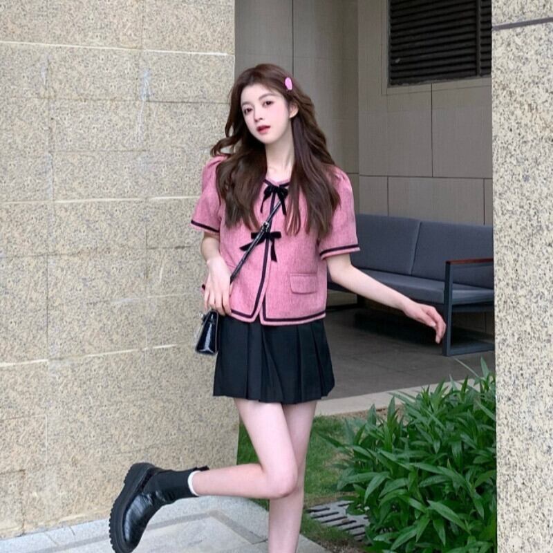 小さな香りフレンチ気質半袖ジャケット女性の夏の甘いパフスリーブ弓ショートトップツーピーススーツ リボン 大人ガーリー スウィート キュート カジュアル サマー 夏物 got25709344451