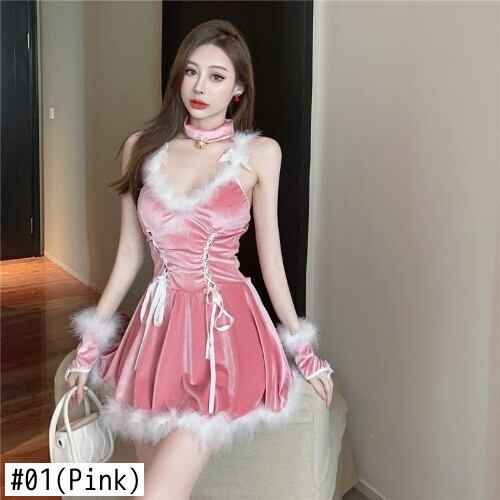 クリスマス セクシー かわいい ベルベット ドレス 毛むくじゃら バックレス Vネック スパゲッティ ストラップ 甘い ese ピンク ガール ドレス 服 大人ガーリー スウィート キュート カジュアル got45445803576