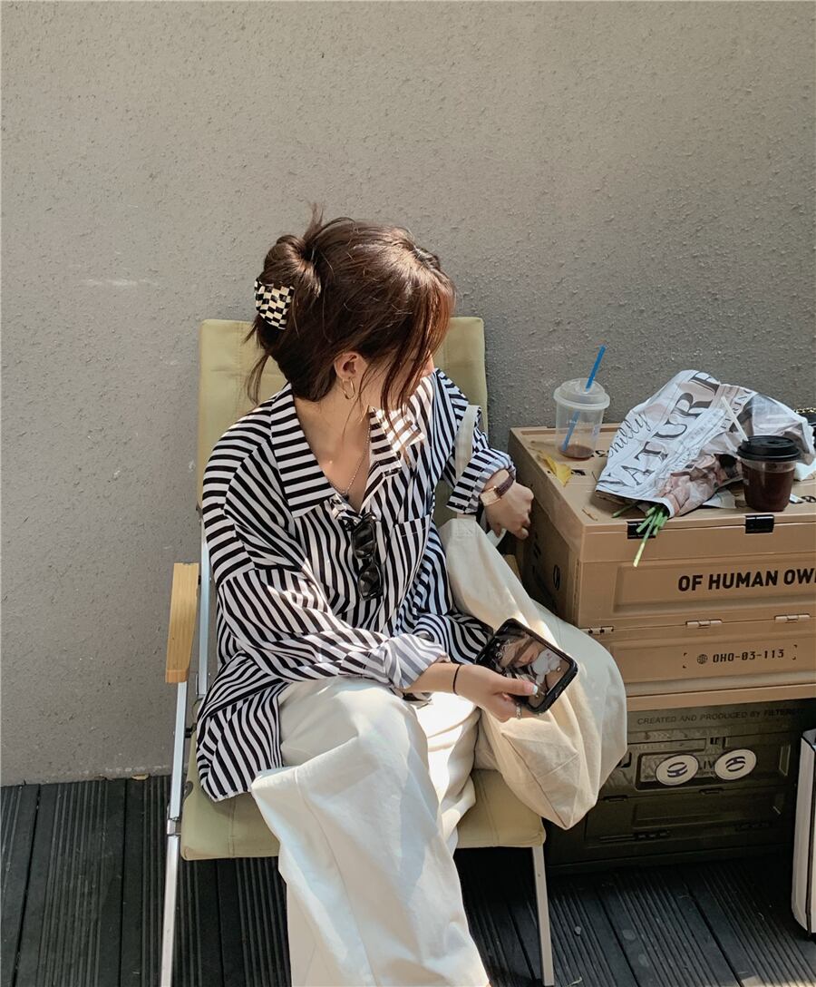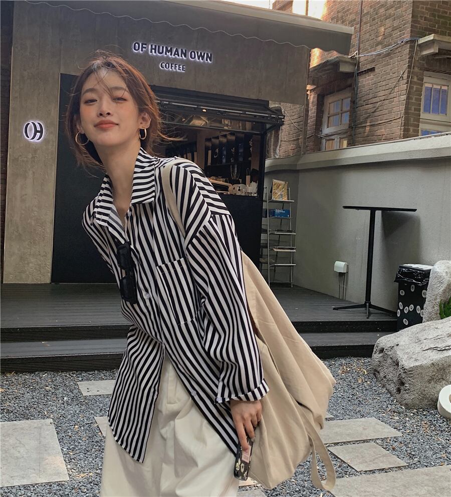 ストライプ原宿ブラウス女性レトロシックなストライプシャツ夏ニッチルーズミドル丈長袖トップ ロング かわいい サマー 夏物 got84234658940