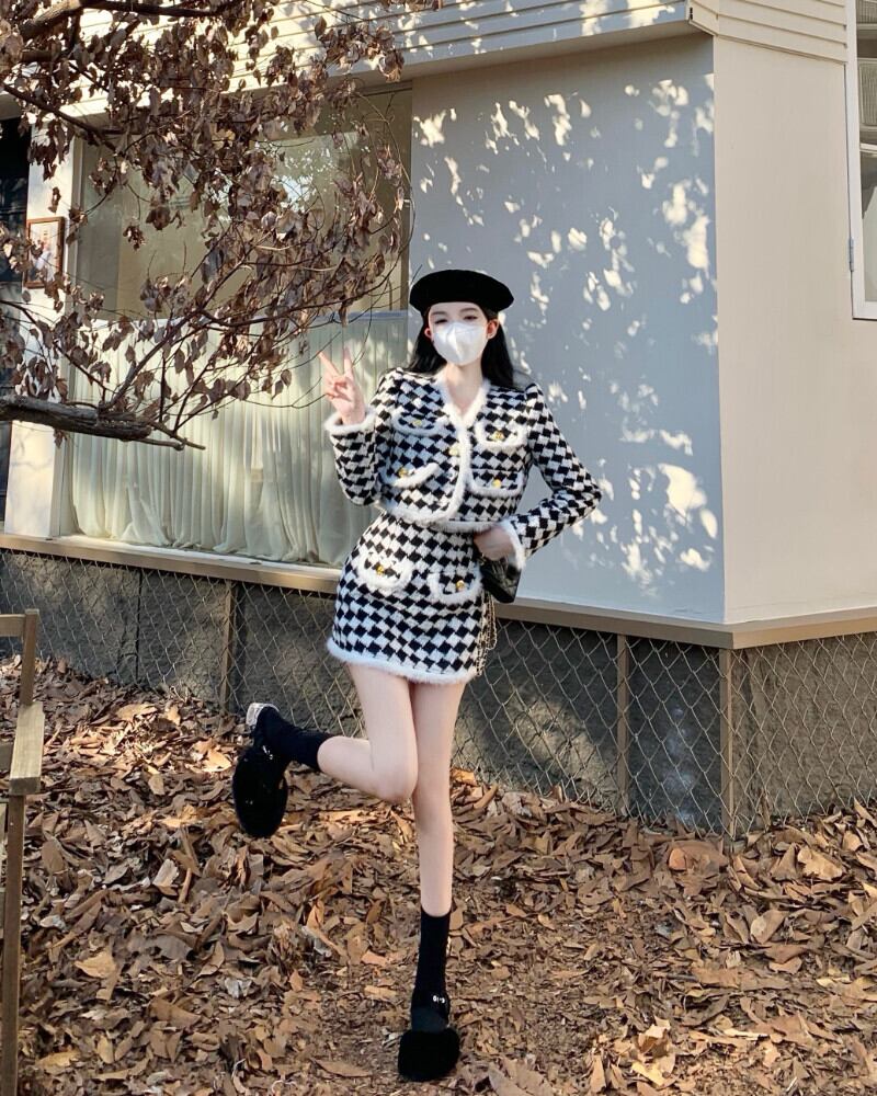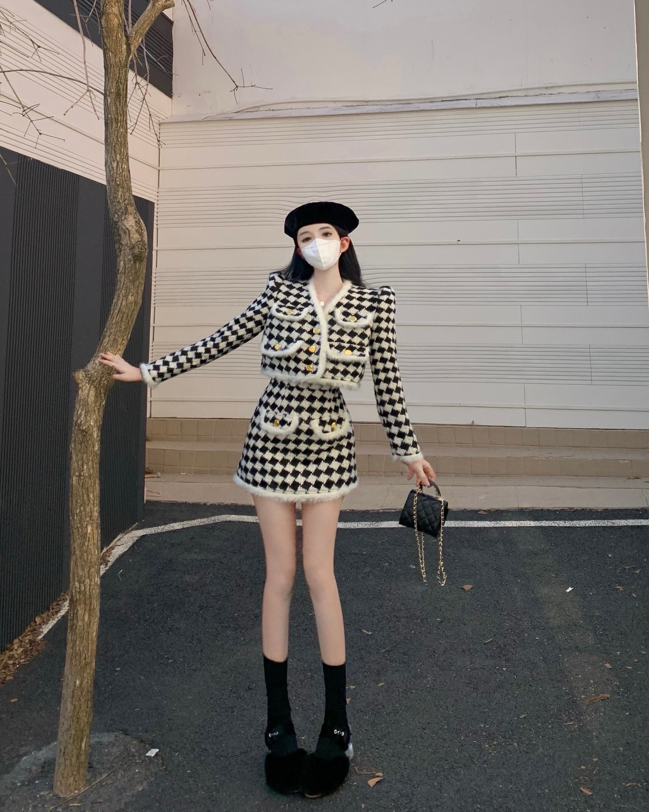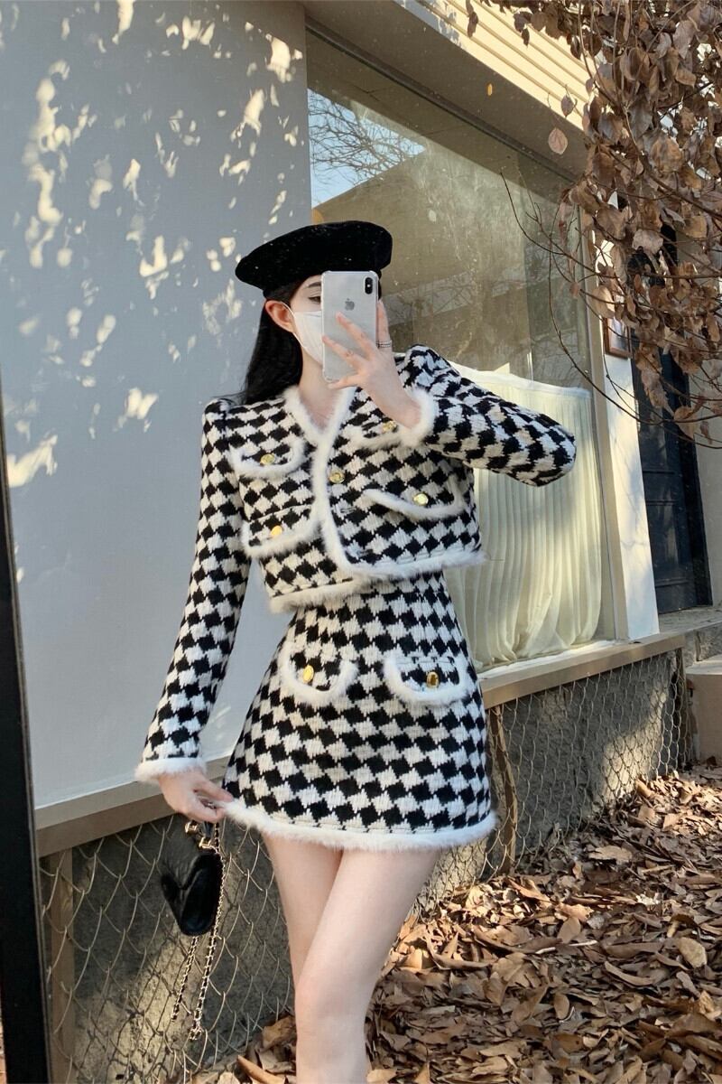 スウィートガールレトロチェック柄スーツ冬コントラストウール肥厚コットンジャケットヒップラップスカート 2 点セット服 大人ガーリー キュート カジュアル ウィンター 冬物 got85027845075