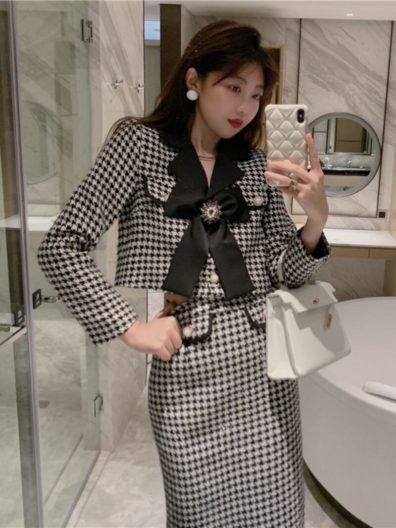 ツイードスーツ 千鳥格子 リボン ターンダウンカラー 長袖 コート ウエストスカート 2点セット 洋服 ロング got97206326793