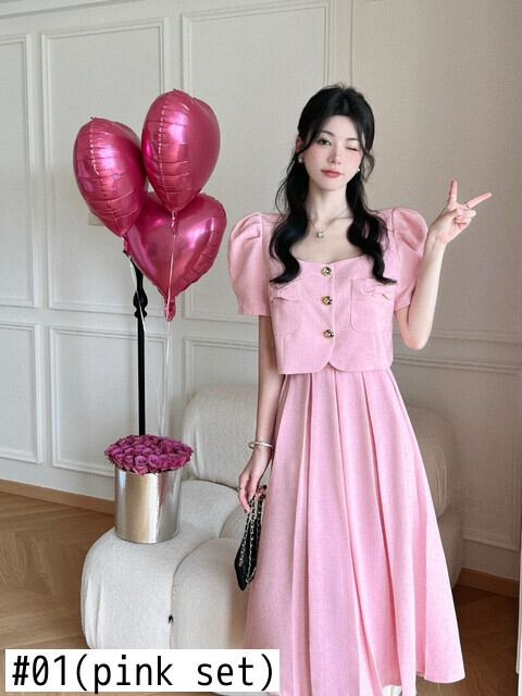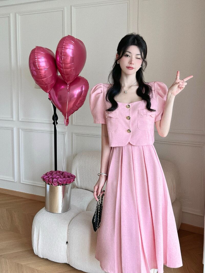 スウィートガール通勤スーツ女性のバブルスリーブボウコートトップウエストミディアム丈スカート 2 点セット服 リボン 大人ガーリー キュート カジュアル got7701203024