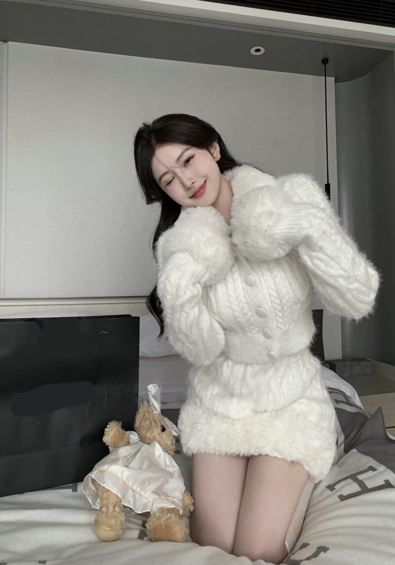 スウィートガール気質スーツ女性の白ニットウール襟コートカーディガントップウエストショートスカートツーピースセット ホワイト 大人ガーリー キュート カジュアル got37969259880