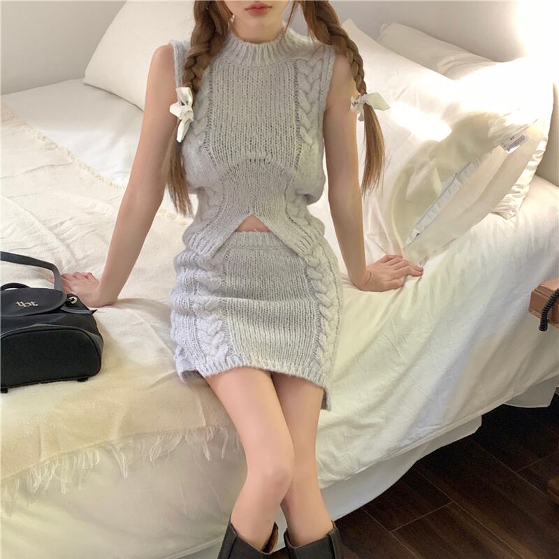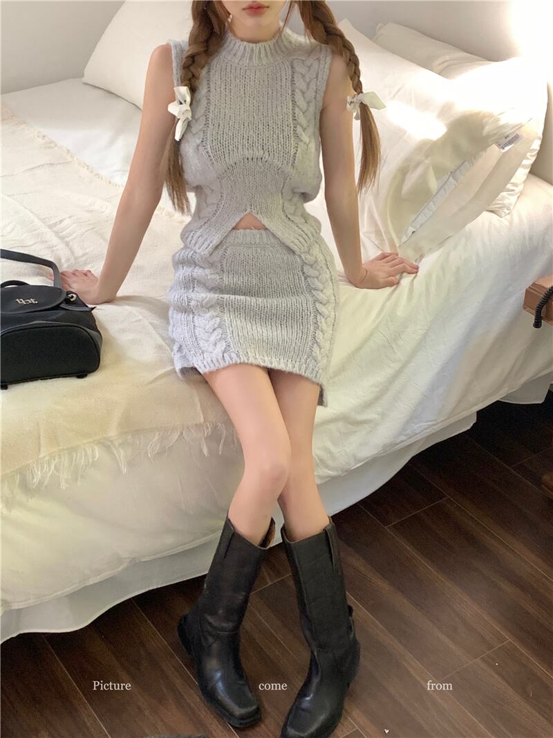 ホットガールスーツ女性のラウンドネックノースリーブツイストスプリットニットベストフィットウエスト臀部スカート 2 点セット Oネック got96631133011