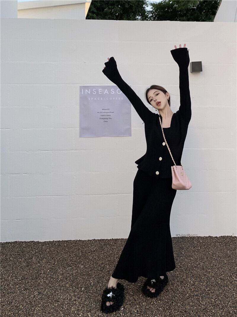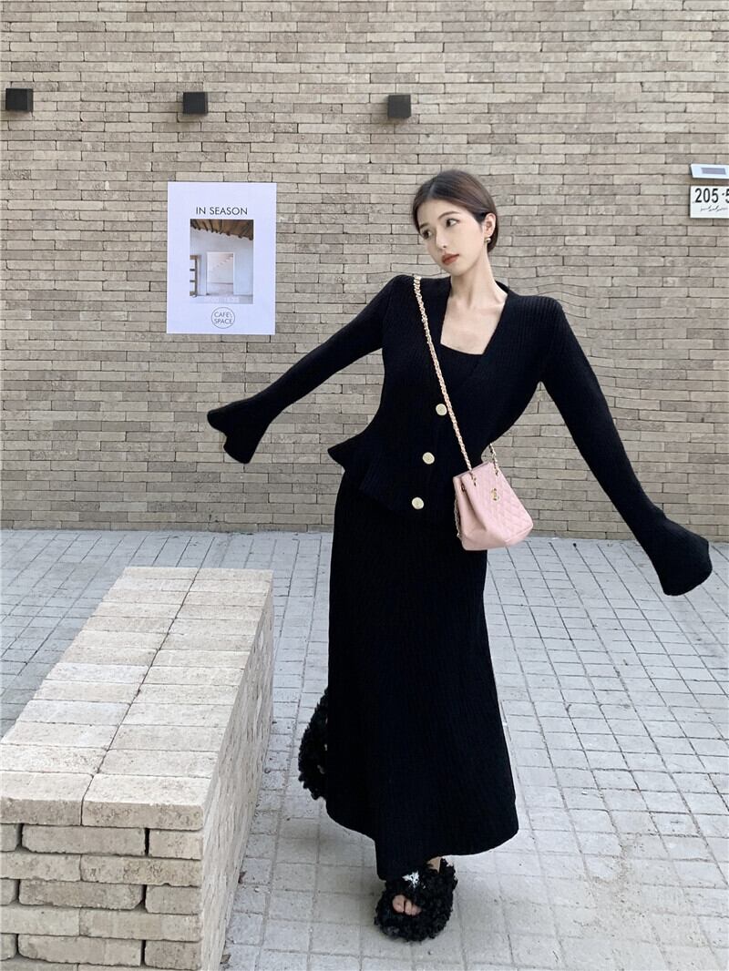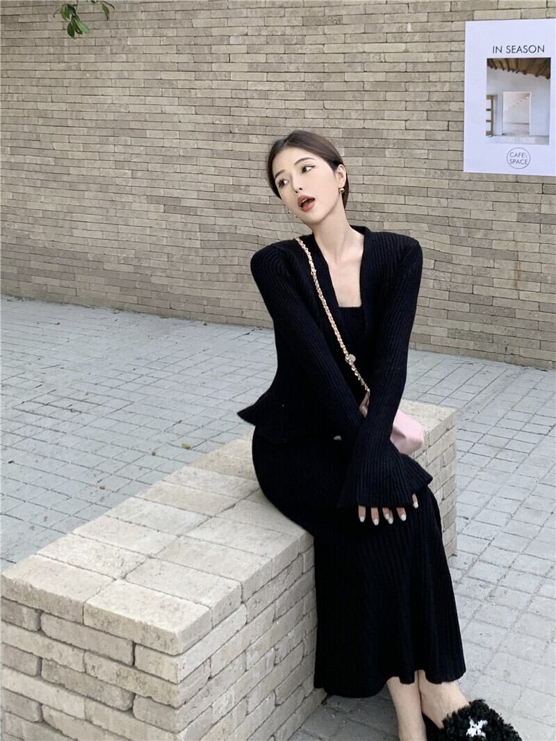 スタイルオフィスレディスーツ冬ニットカーディガンコート女性のスパゲッティストラップドレスツーピースセット服 ウィンター 冬物 会社 学校 通勤や通学にも got4064718751