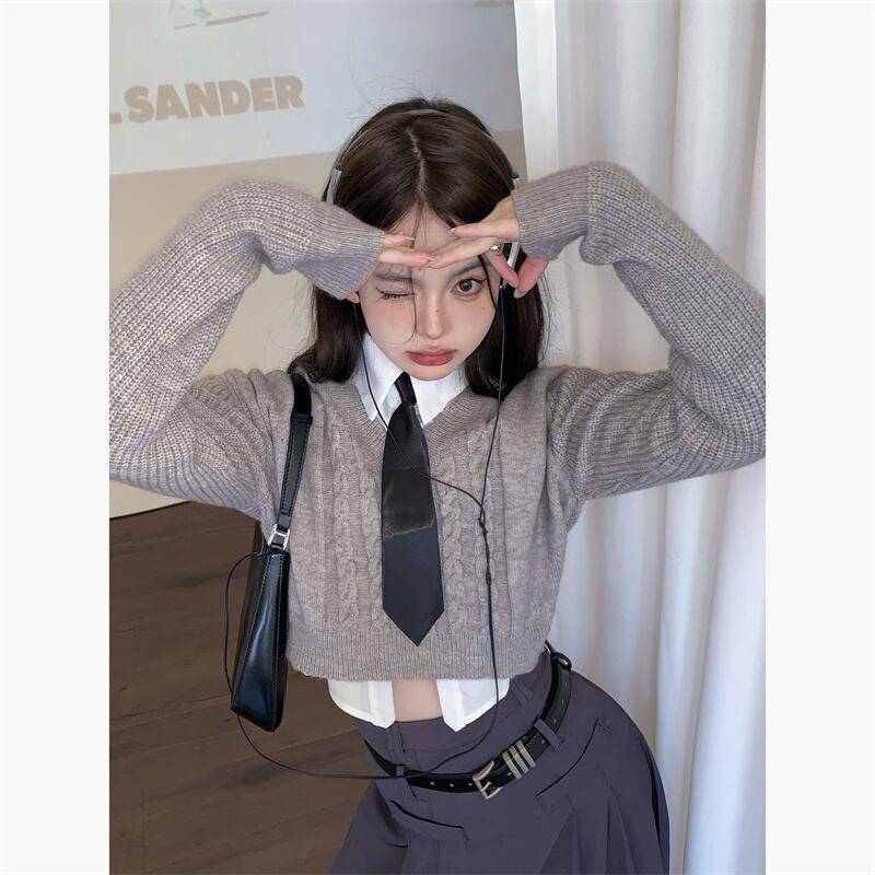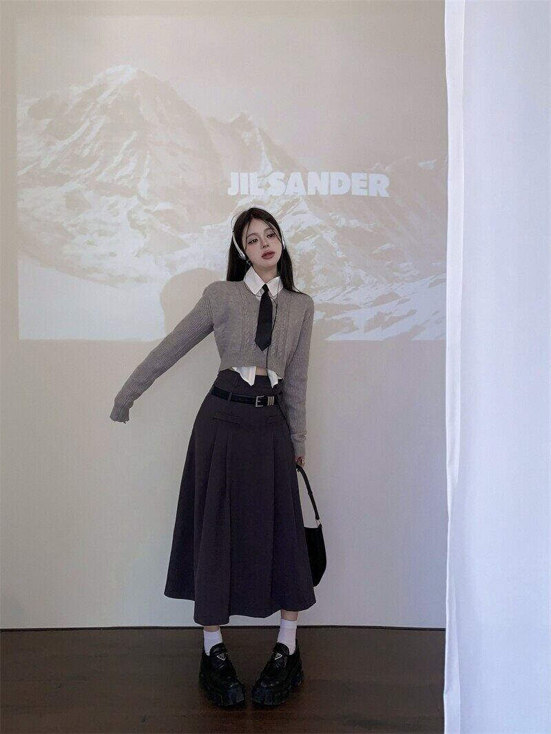 プレッピースタイルスーツ長袖ショートツイストセーター白シャツグレーミディアムロングプリーツスカート服 ホワイト got62839685233