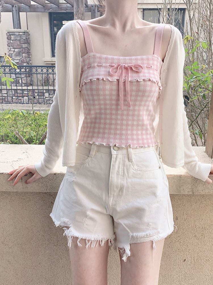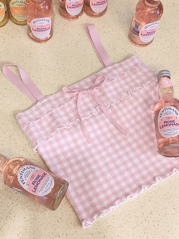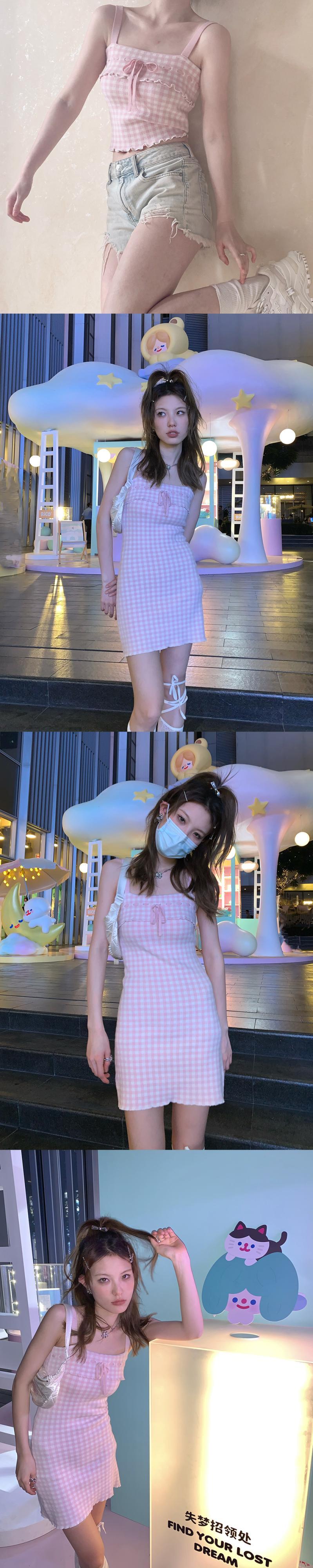 タンクトップ レース ボウ サスペンダー ベスト かわいい トップス ノースリーブ チェック柄 スラッシュネック キャミソール レディース ピンク 女性服 リボン 大人ガーリー スウィート キュート カジュアル got39260544950
