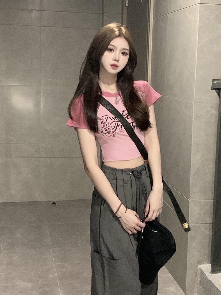 レディースツーピースセットピンク半袖Tシャツオーバーオールサマーホットガールズパンツプレッピースタイルサマーセット ショート ハーフスリーブ 夏物 got52937971628