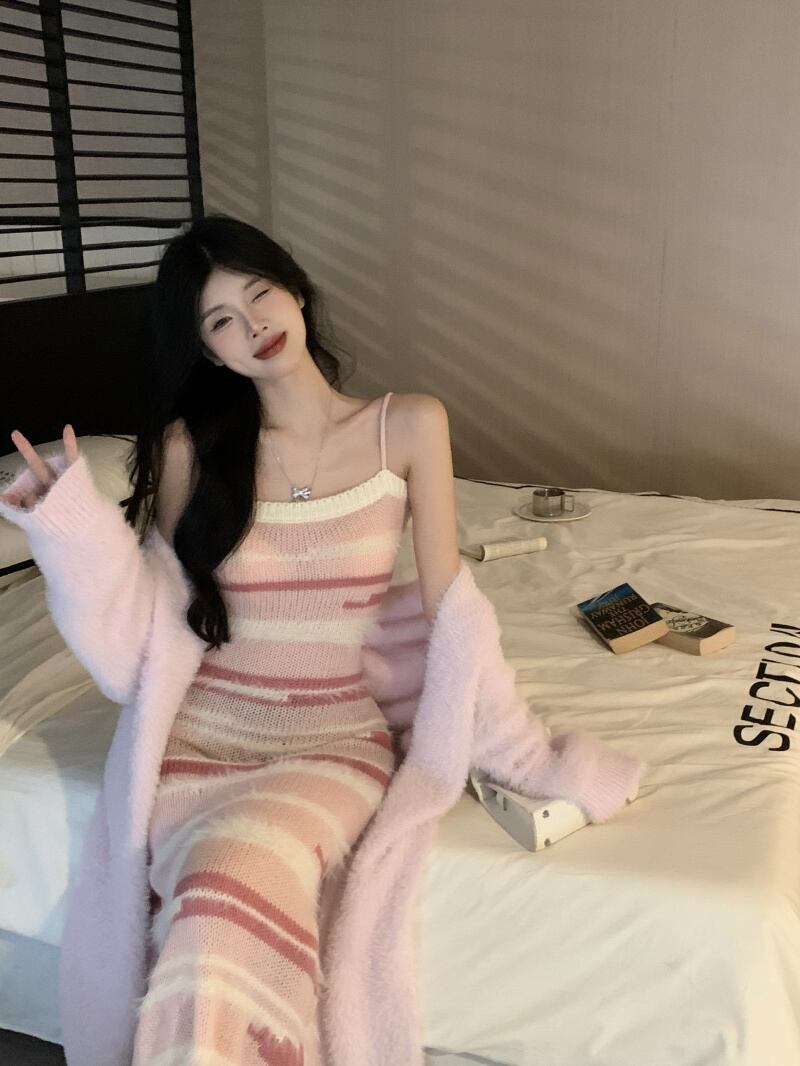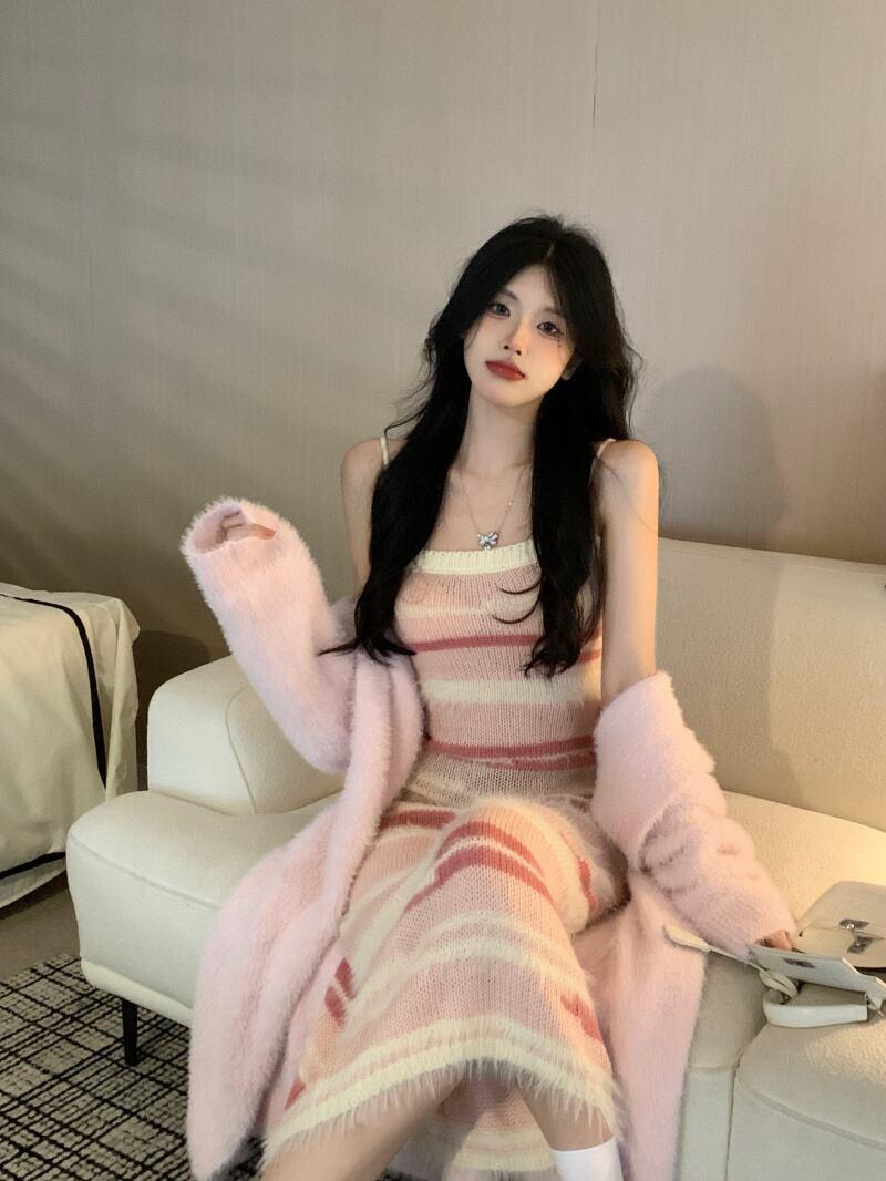 ジェントルフレンチスーツ カラーコントラスト スパゲッティストラップ ロングドレス レディース 秋冬 モヘアセーター カーディガン 2点セット オータム 秋物 ウィンター 冬物 got92219421826