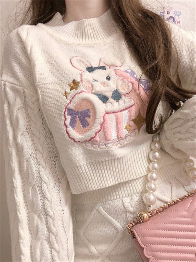 秋のスーツの女性のラウンドネックの漫画の印刷長袖セーターウエストニットスカート 2 点セット ロング オータム 秋物 Oネック got82509986826