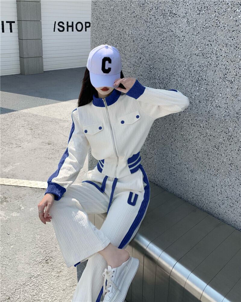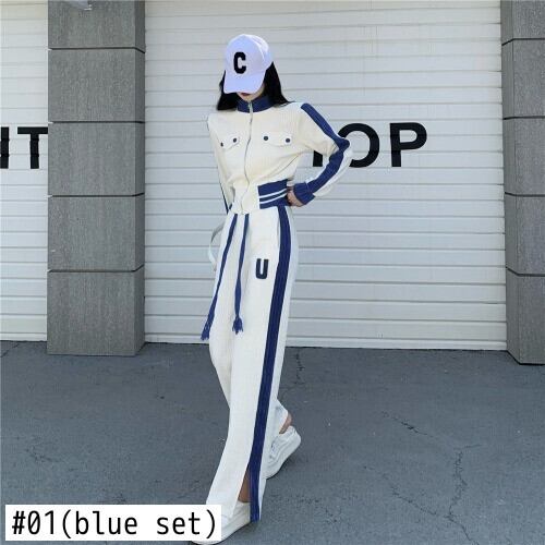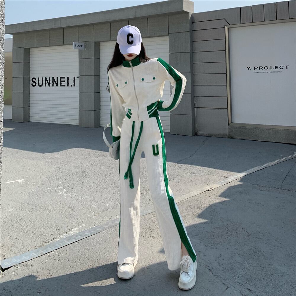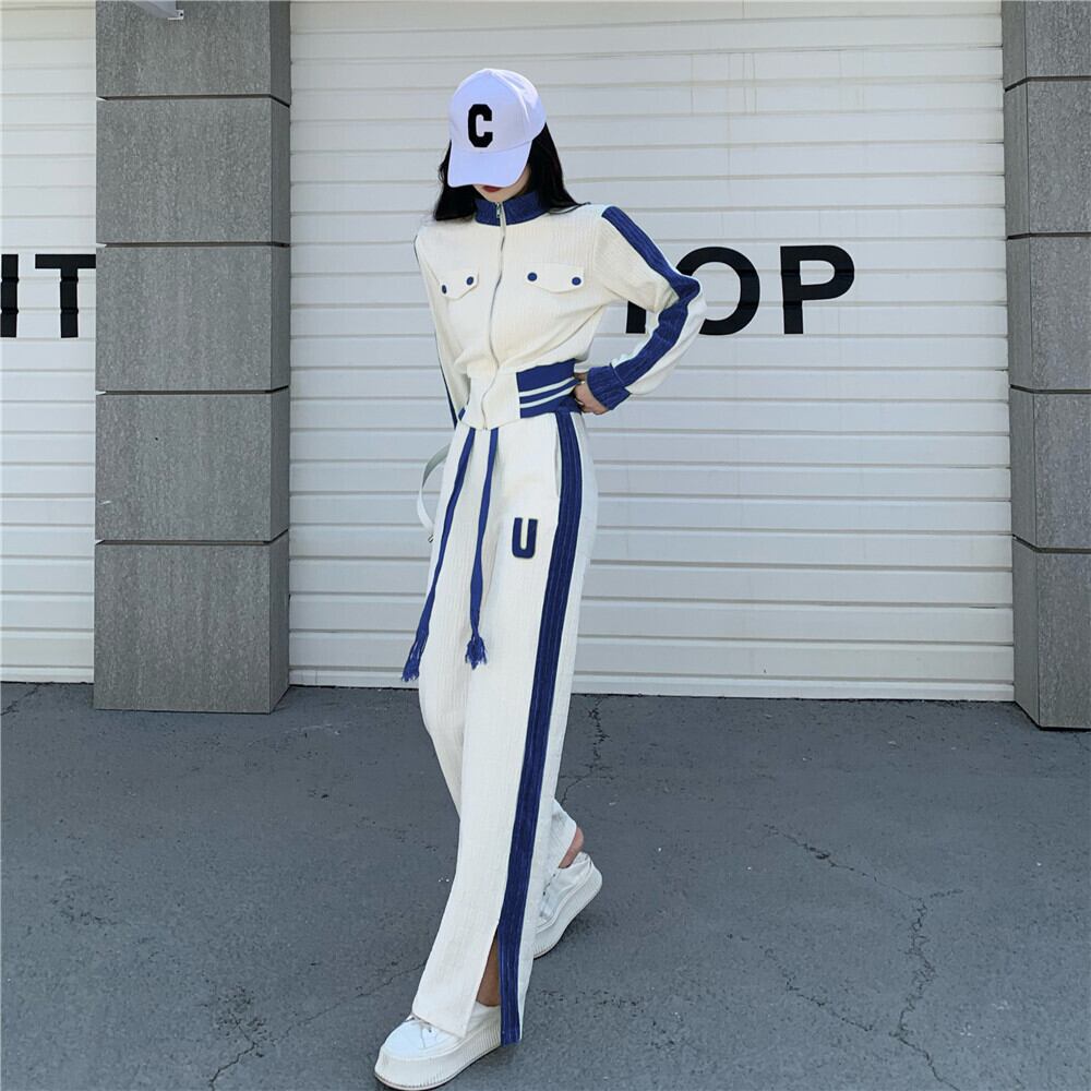 春先 スーツ レディース ジャガード スタンドカラー スリム 長袖 コート ウエスト コントラスト スポーツ ワイドレッグ 2点セット ロング スプリング 春物 ワイドパンツ got16400291867