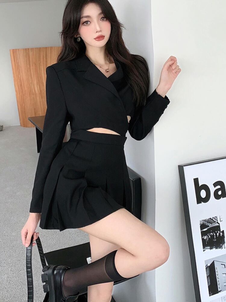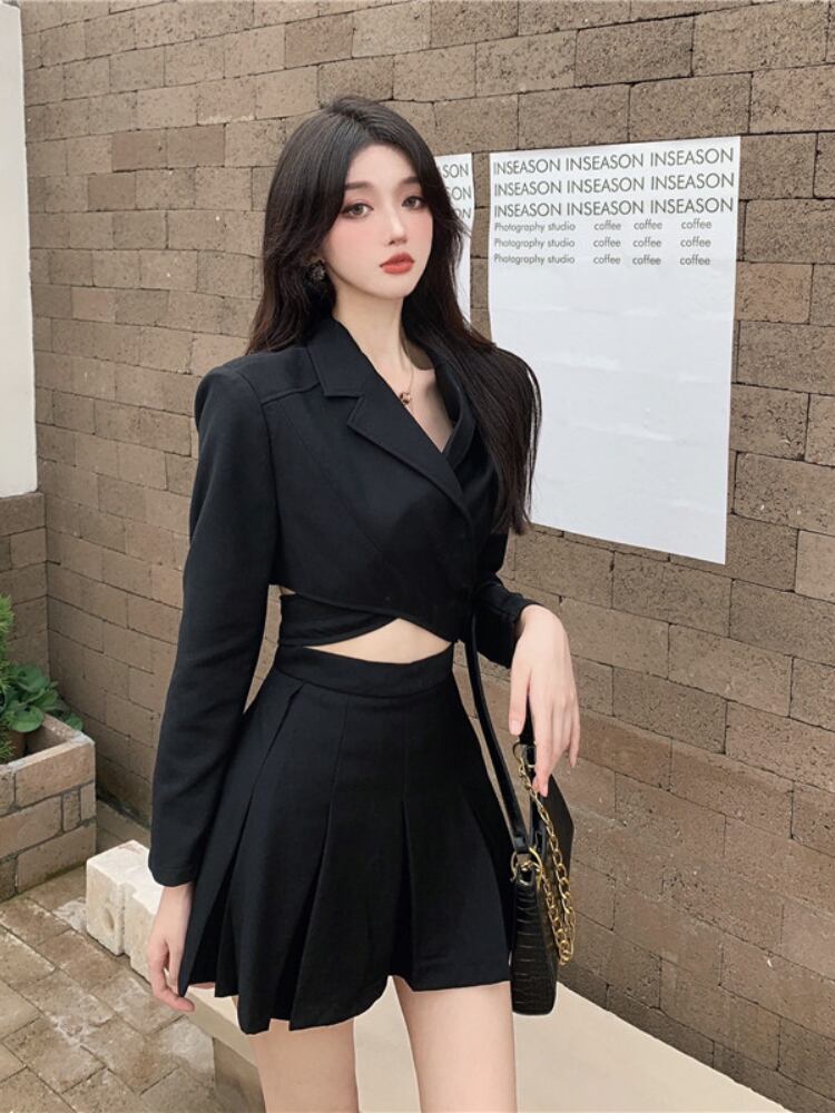 Gothiscyn 女性黒ショートスーツプリーツスカート早春スーツ純粋な欲望ホットガールツーピースセットスーツ ブラック スプリング 春物 ピュア got56116182708