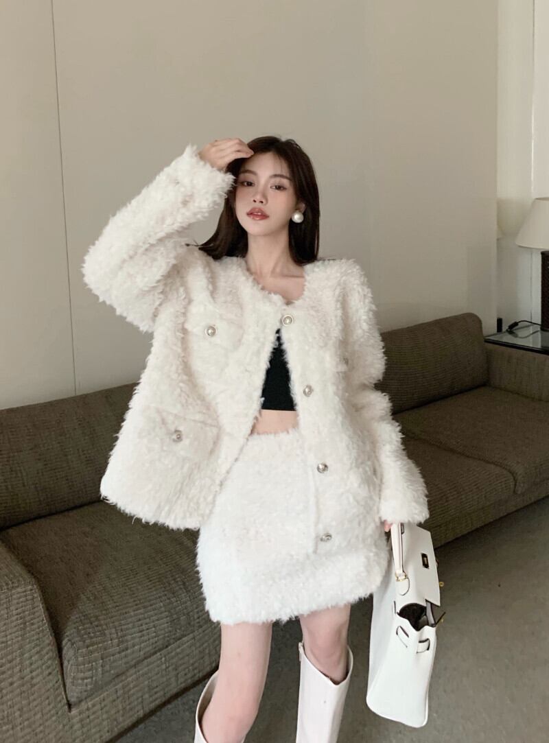 スウィートガールスーツラムウール気質カーディガンコート女性の冬の白いウエストスカートツーピースセット服 ホワイト 大人ガーリー キュート カジュアル ウィンター 冬物 got62990265589