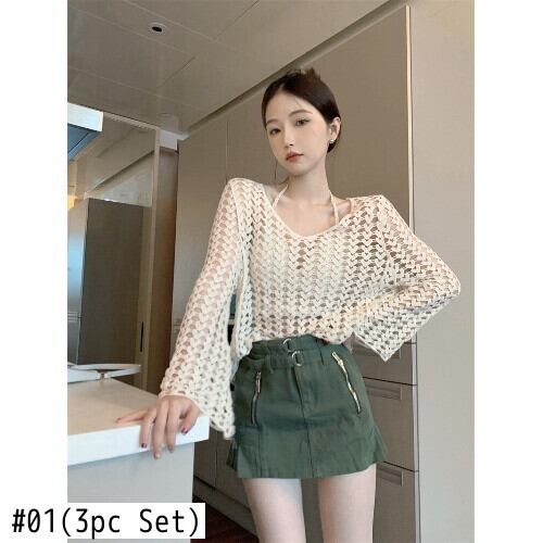 セットセーター+スカート中空長袖ニットセーター女性ホルターキャミソール夏レトロショートスカート3点セット ロング サマー 夏物 got23245047224