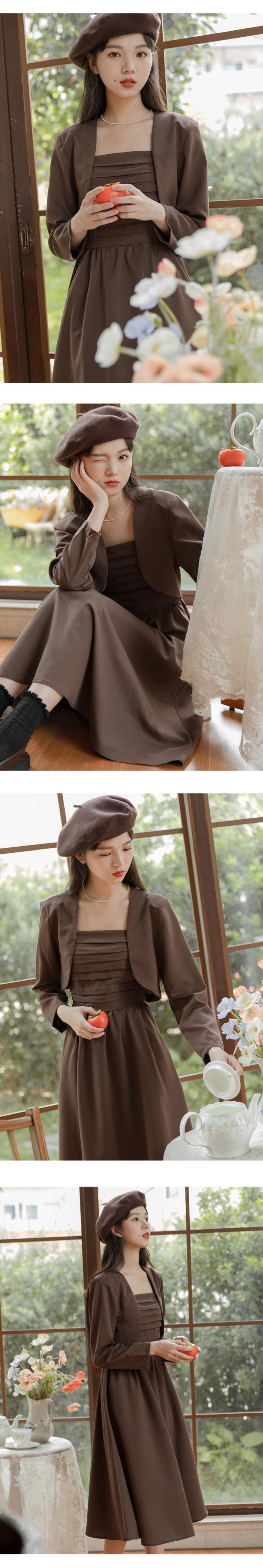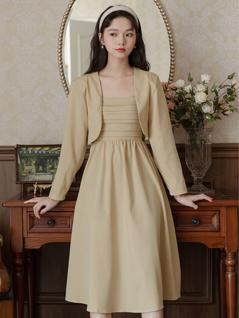 OL 春 スーツ レディース プリーツ サスペンダー ノースリーブ スリム ワンピース 長袖 スーツ コート 2点セット 婦人服 ロング スプリング 春物 会社 学校 通勤や通学にも got42823928210