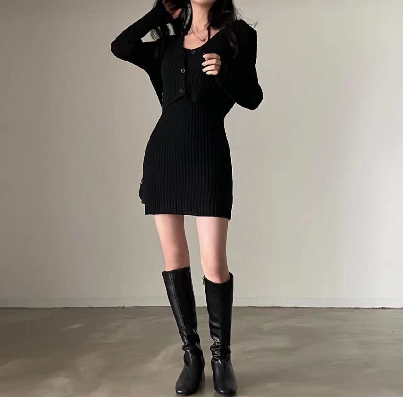 シックな秋のスーツの女性のショート ニット カーディガン ショール U ネック スリム ラップ ヒップ ドレス 2 点セット服 オータム 秋物 got98741652031