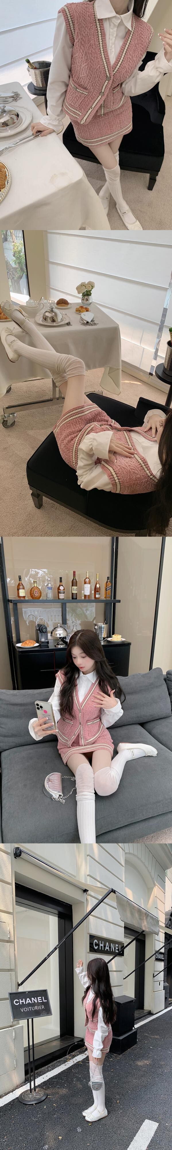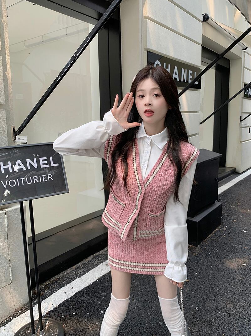Sweet Girl 秋と冬のスーツの女性の V ネック カラー コントラスト ニット ベスト ウエスト スリム スカート ホワイト シャツ 3 点セット 大人ガーリー スウィート キュート カジュアル オータム 秋物 ウィンター 冬物 Vネック got14789383433