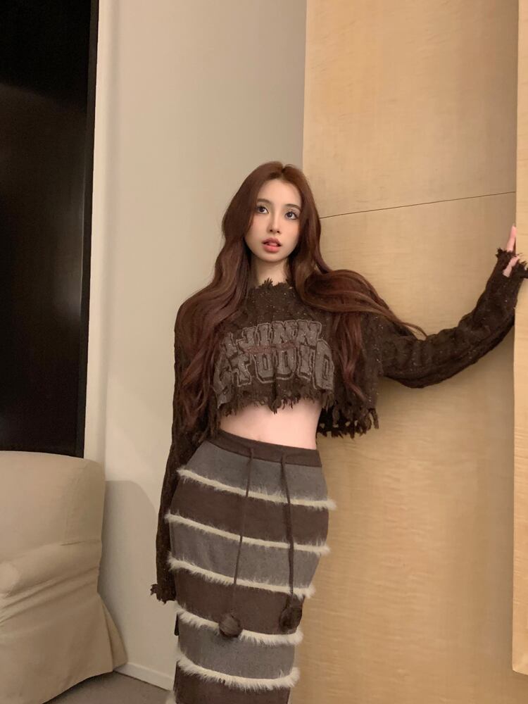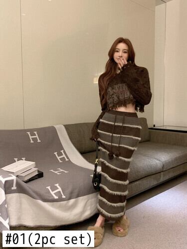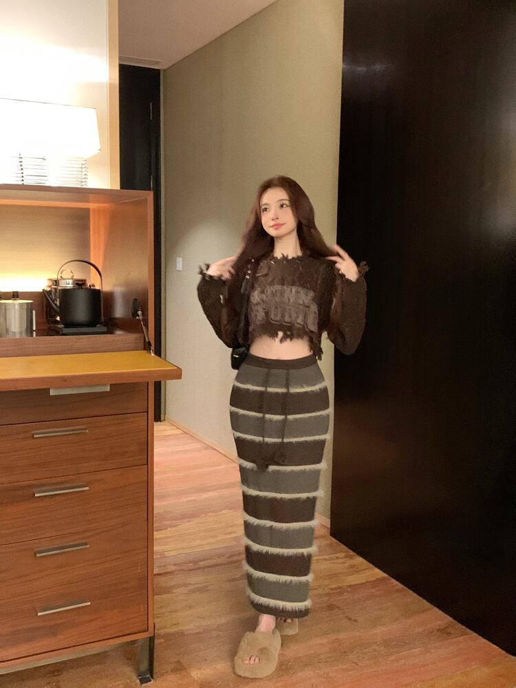 ホットガールスーツ女性の長袖 O ネックショートセーター電話ニットトップストライプコントラストウエストスカート 2 点セット ロング Oネック got19231346939