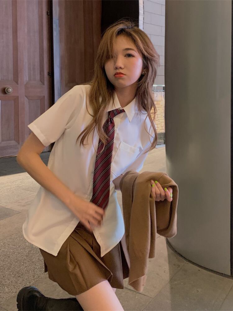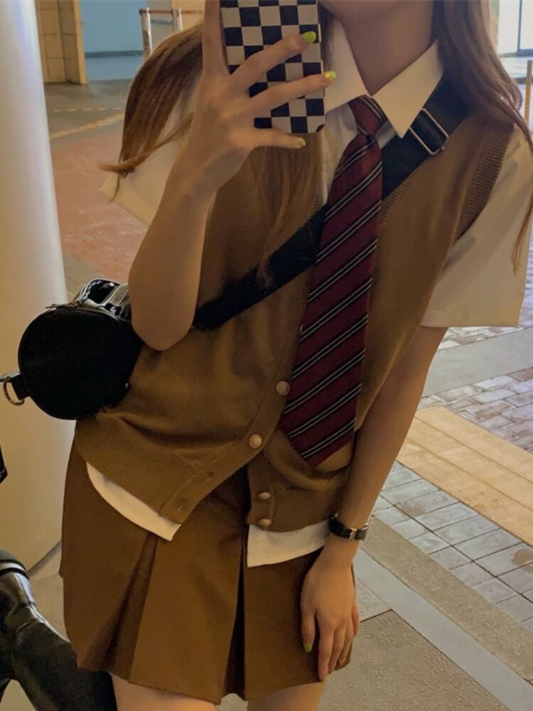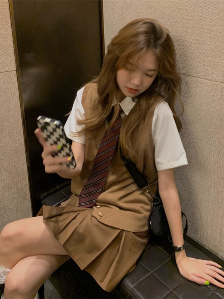 Gothiscyn スクールスーツブラウンニットベスト夏スーツホットガールスリムシャツスカートハーフスカート 3 点セットセクシー サマー 夏物 got94412543858
