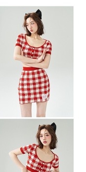 ホットガールズスーツ女性のチェック柄半袖uネックセータートップウエストヒップラップスカートツーピースセット服 got10315724332