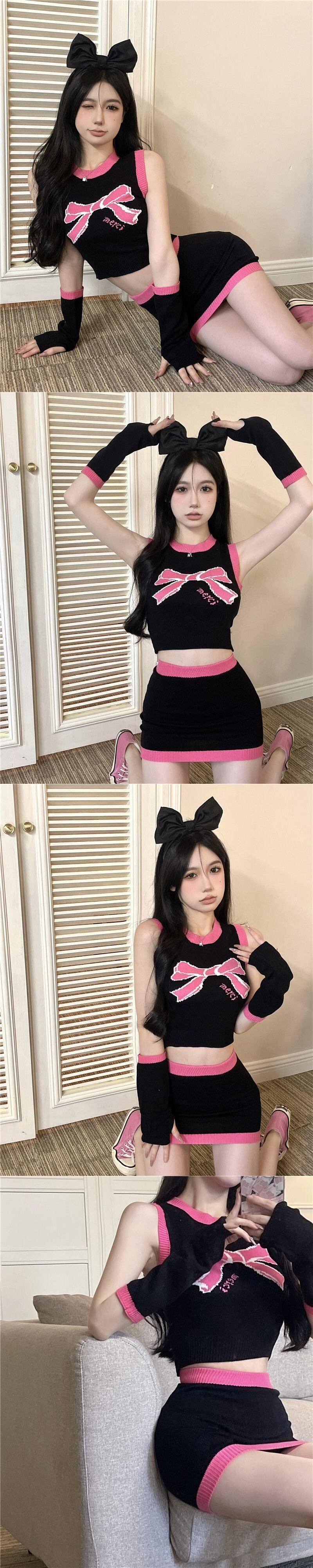 夏アメリカンホットガールスーツ女性の弓カラーブロックタンクトップと袖ウエストラップヒップショートスカート 2 点セット リボン サマー 夏物 got50671630515