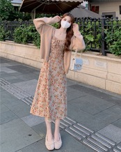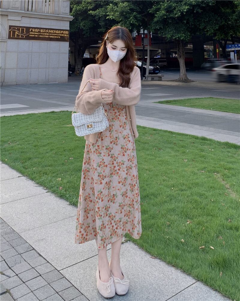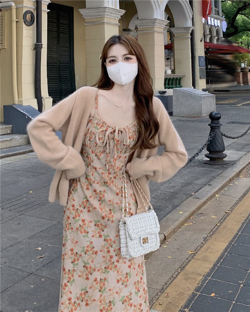 甘いレトロなスーツ コーデュロイ花柄サスペンダー ドレス ソフト暖かい万能ショート セーター カーディガン 2 点セット服 大人ガーリー スウィート キュート カジュアル got85269674073
