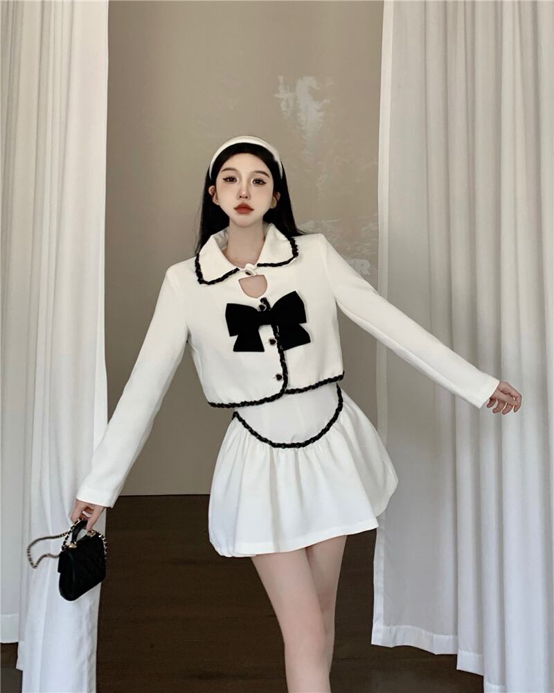スウィートガールスーツ女性の弓長袖ターンダウン襟ジャケット A ラインふくらんスカート 2 点セット服 ロング リボン 大人ガーリー キュート カジュアル Aライン got76839383093