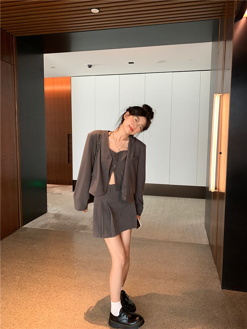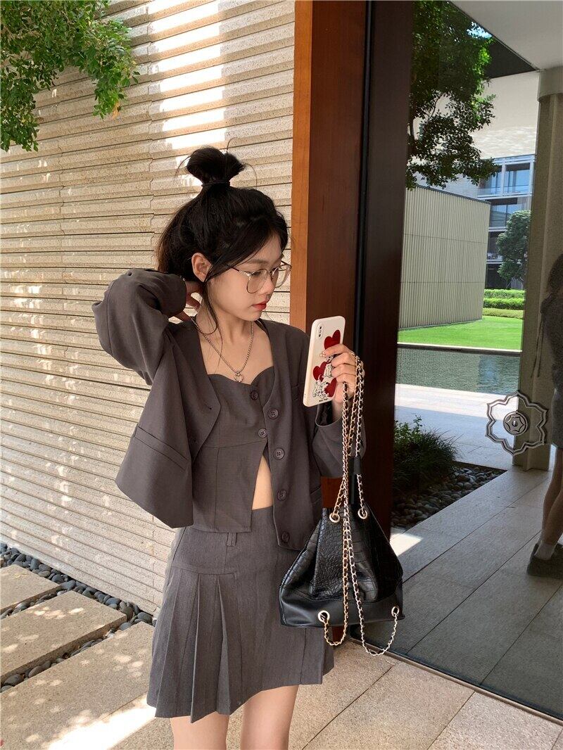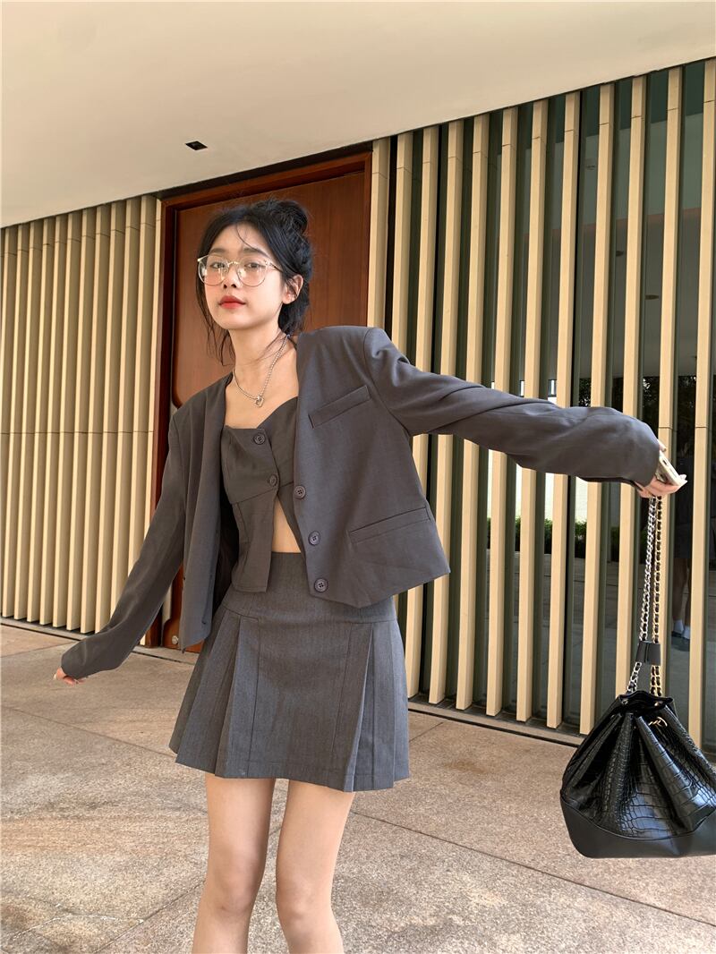 スタイルスーツ レディース サスペンダーベスト グレー 長袖 ジャケット 春 Aライン プリーツスカート 3点セット ロング スプリング 春物 got90587309388
