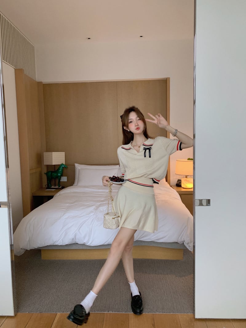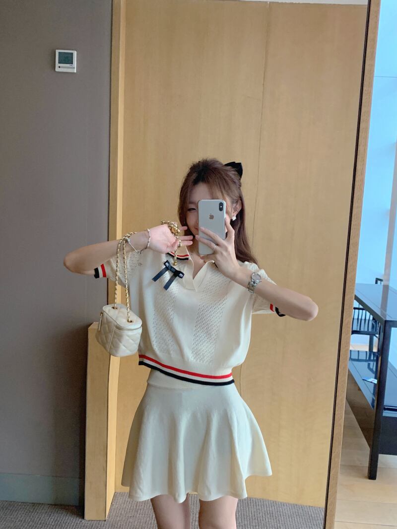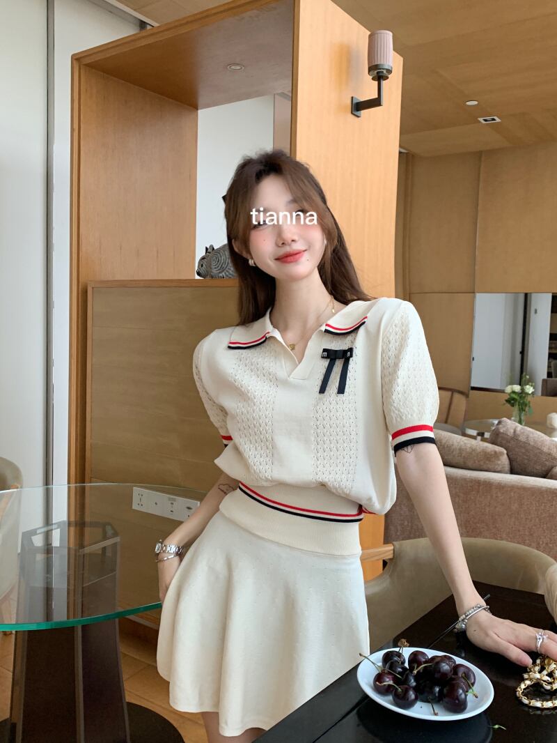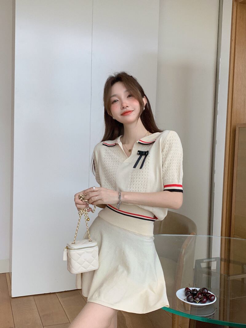 Style ニットスーツ レディース ポロシャツ Vネック 半袖 トップウエスト Aライン スカート 2点セット 洋服 ショート ハーフスリーブ got68951571978