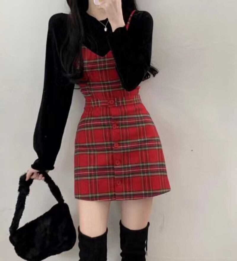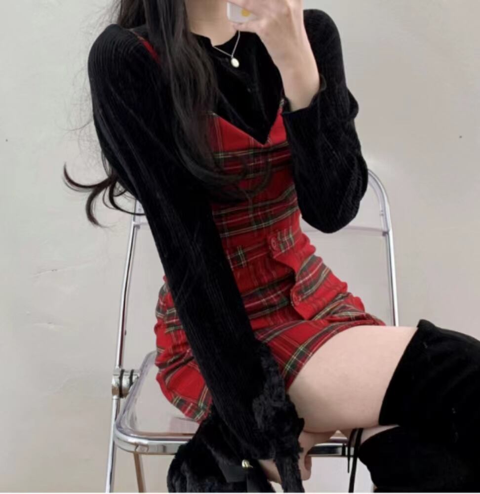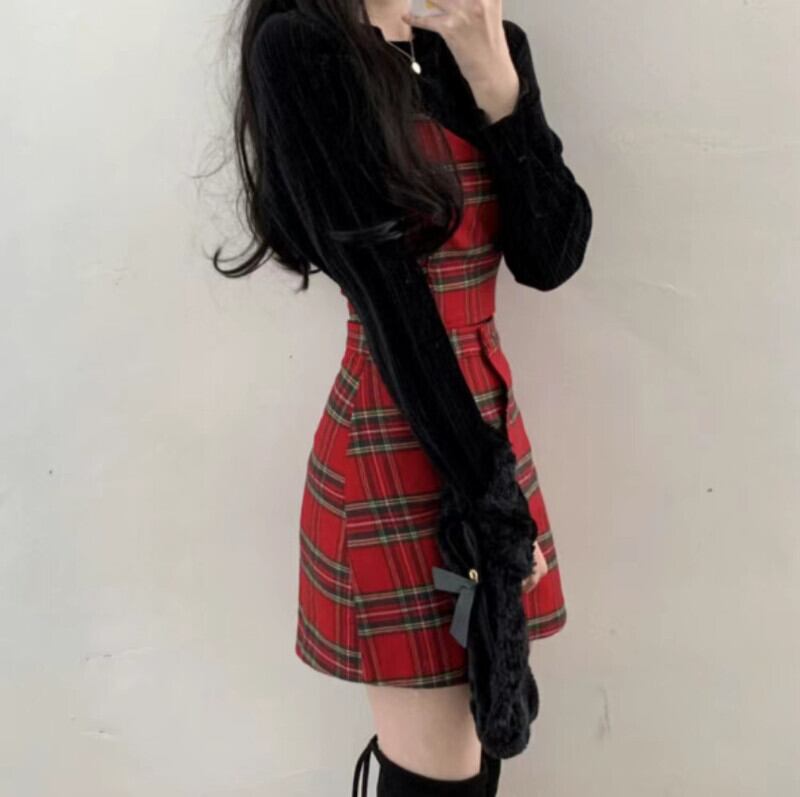 クリスマス格子縞のスーツの女性の冬のスタイルのストラップベストハーフスカート黒のベルベットのアンダーコート甘いスリーピースセット ブラック 大人ガーリー スウィート キュート カジュアル ウィンター 冬物 got61255867219