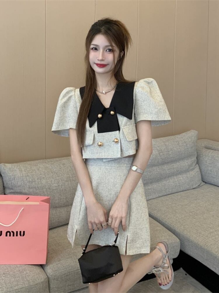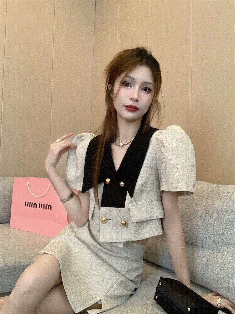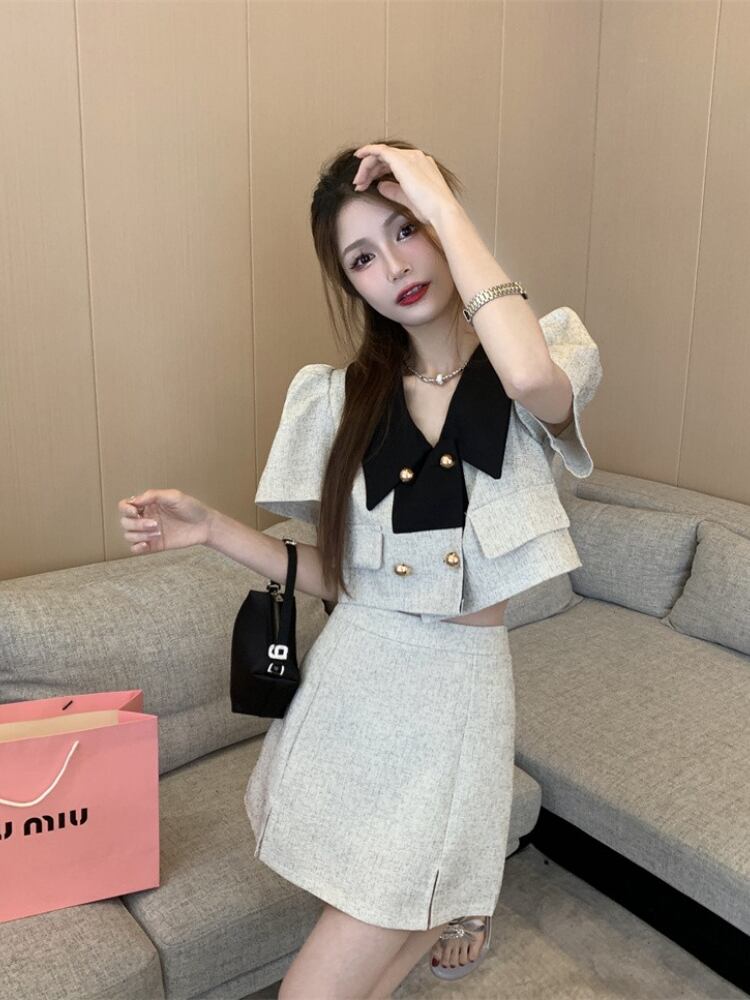 スーツ夏スカートセットコントラストカラーダブルブレスト半袖トップスカート 2 点セット女性 ショート ハーフスリーブ サマー 夏物 got74359652741