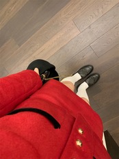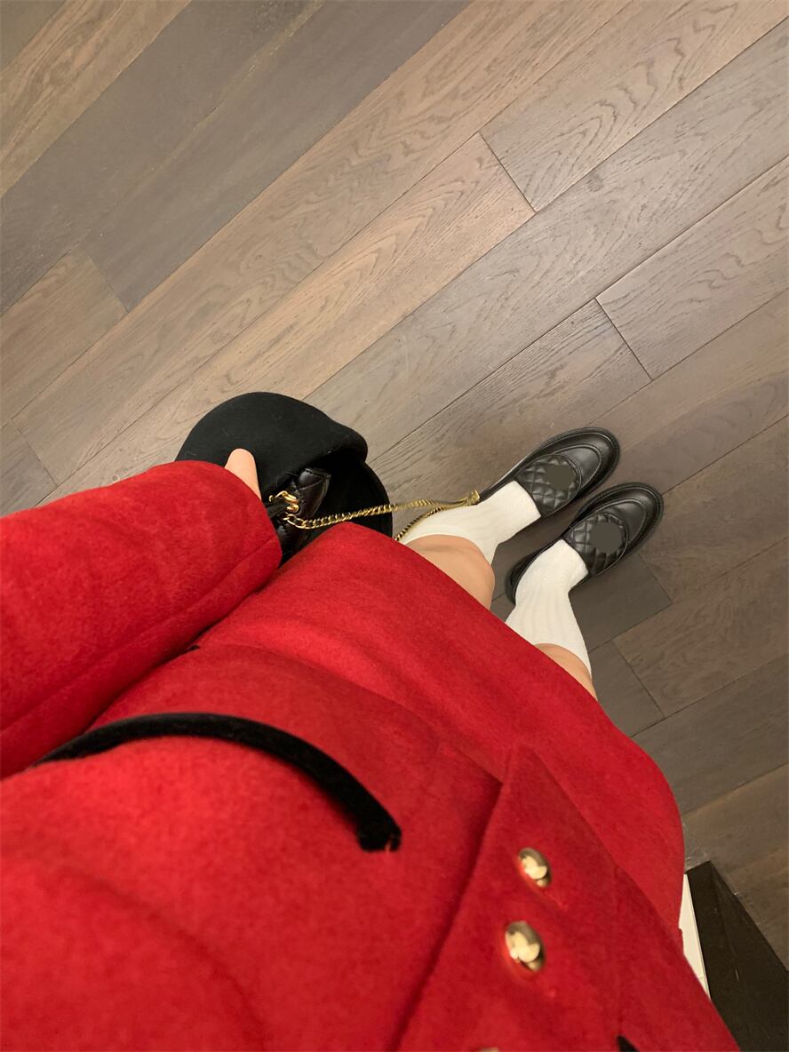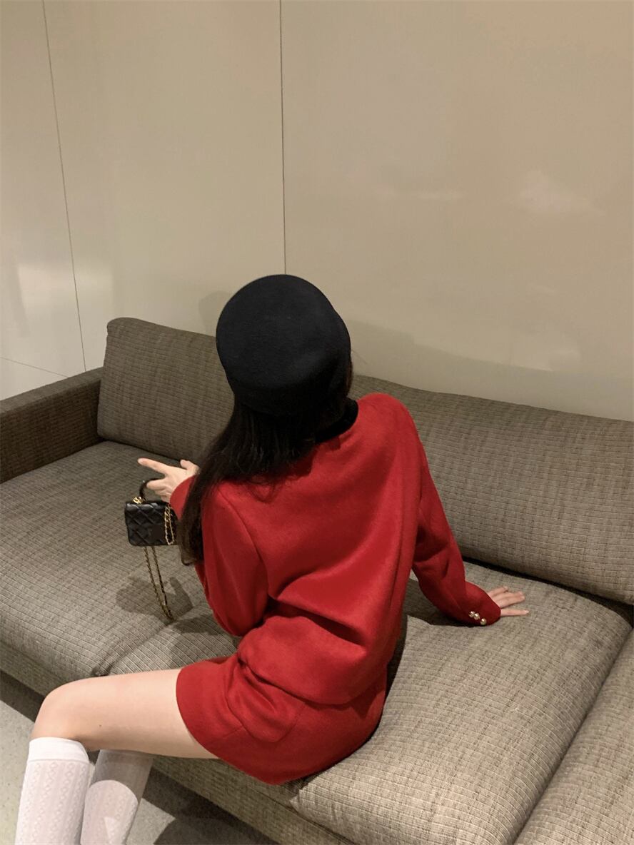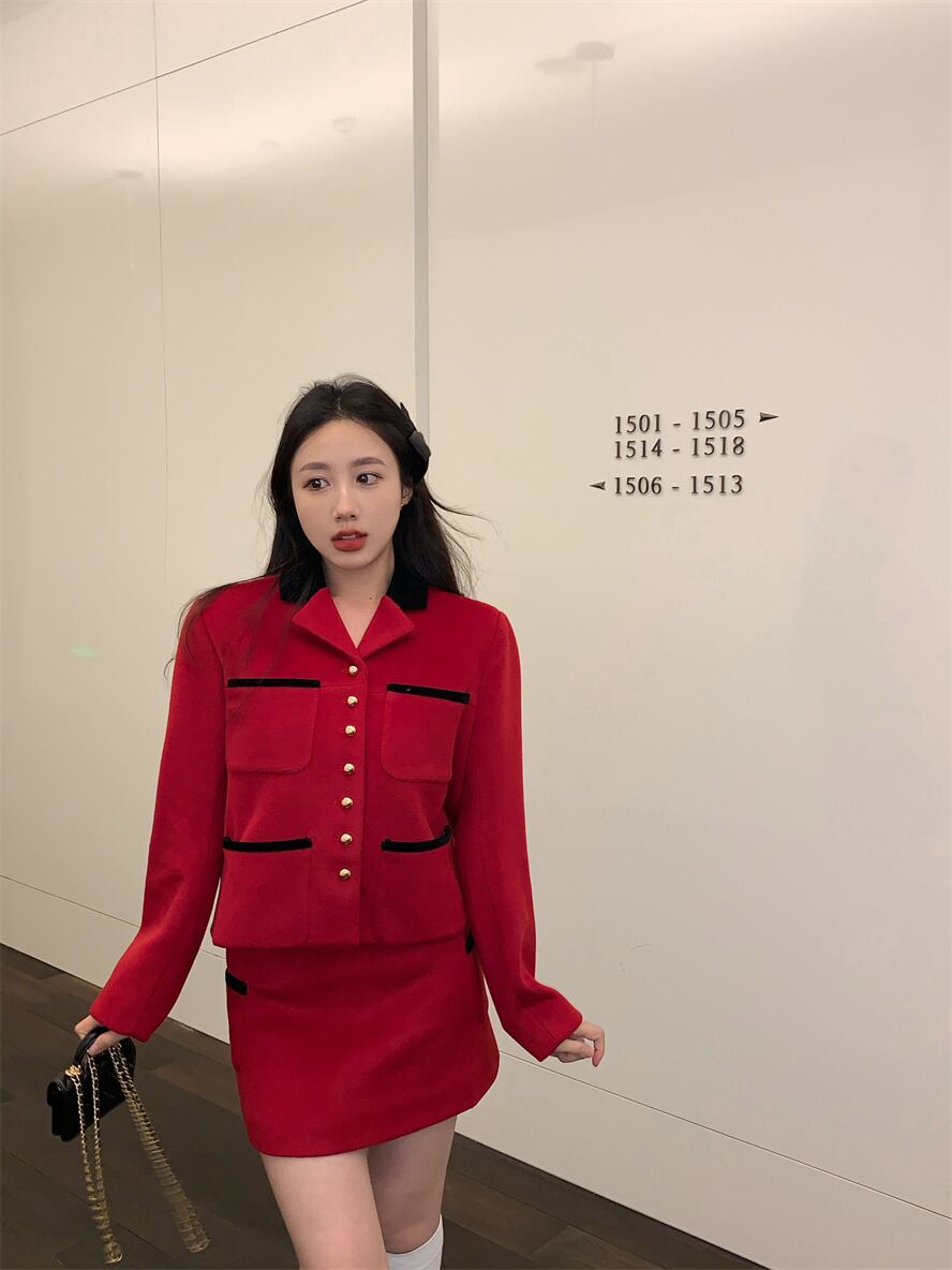 フランスのレトロセレブスーツ赤長袖ターンダウン襟カーディガンコートウエストスリムスカートツーピースセット服 ロング レッド got13625790257